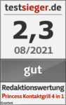 Der Princess Kontaktgrill Snack 4 in 1 ist ein guter Multifunktionsgrill, besonders als Kontaktgrill zeigt er sein Können. Die Heizfläche reicht stets gleichmäßig bis an den Rand. Die Temperatur reguliert sich aber besonders beim Tischgrill zu oft und zu lang nach unten, sodass Grillgut bedeutend länger bis zum Garzeitpunkt braucht. Die Ergebnisse sind dennoch zufriedenstellend. Die Auswahl an Grillplatten überzeugt, auch wenn sie etwas locker im Gerät sitzen. Größter Kritikpunkt ist die sehr einseitige Temperaturregelung und das Fehlen einer Timer-Funktion. In der Praxis funktionieren alle Grillfunktionen gut, sobald Nutzerinnen und Nutzer die richtige Temperatur und Zeit herausgefunden haben.