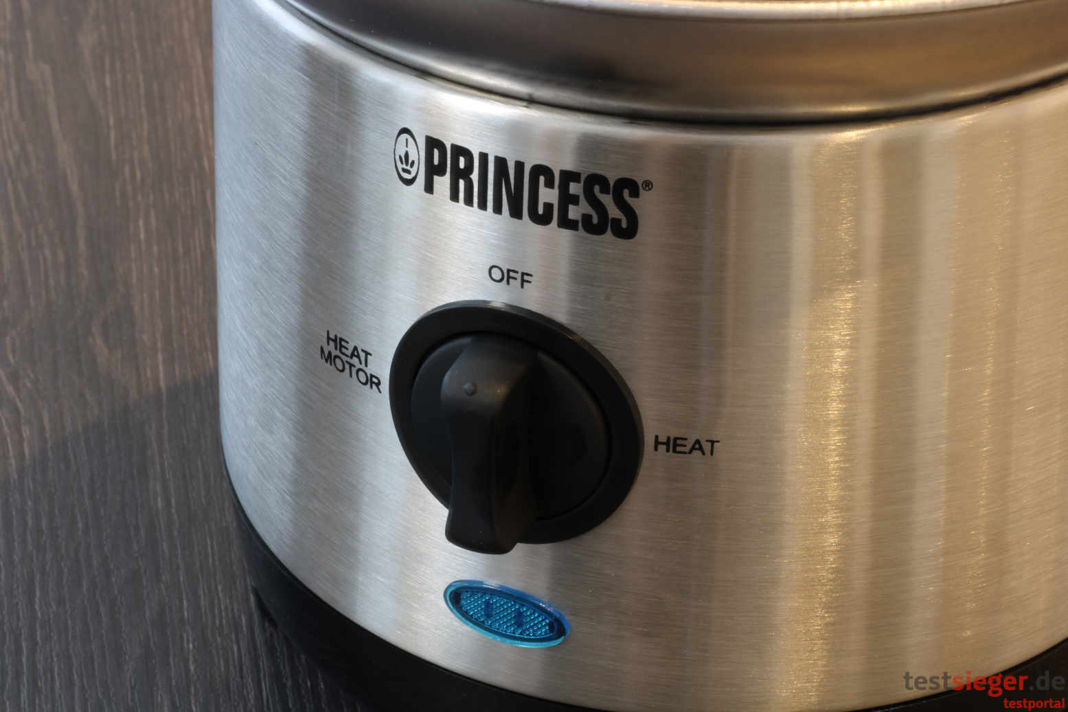 Auf der Frontseite befindet sich ein Drehrad mit drei Positionen. In der Mitte schaltet sich der Brunnen aus, hinzu kommt die Heizfunktion, die die Schale erwärmt. Wir messen bis zu 40 Grad Celsius, was durchaus genügt, um Schokolade zu schmelzen, es aber zu einer langwierigen Angelegenheit macht. Princess selbst empfiehlt, die Leckerei auf dem Herd über einem Wasserbad zu schmelzen, was wir bestätigen können. Durch die Wärme besteht jedoch keine Gefahr, dass die Schokolade im Brunnen wieder erhärtet. Die dritte Position des Drehschalters ist Heizen in Kombination mit dem Motor. Nur hier befördert die Spirale die Schokolade nach oben. Der Schalter ist recht leichtgängig und rastet fest auf jeder Position ein. Wir hätten uns jedoch eine feinere Geschwindigkeitsabstufung gewünscht. Unter dem Rad zeigt eine Leuchte den Betrieb an.