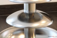 Aufgrund des hohen Metallanteils kann sich die Verarbeitungsqualität sehen lassen. Das Gehäuse besteht genauso aus dem Material wie die verschiedenen Ebenen und der Turm. Die Spirale ist dagegen aus festem Kunststoff gefertigt. Die einzelnen Komponenten des Turms und der Motoreinheit sind dabei fest verbunden, die Übergänge recht sauber. Zur Montage setzen Nutzerinnen und Nutzer den Turm über drei Kunststoffstifte auf die Basis. Die Konstruktion ist jedoch recht wackelig, auch wenn keine Gefahr besteht, dass das Oberteil umkippt. Doch gerade in Anbetracht der Motorvibrationen hätten wir uns eine etwas stabilere Gesamtkonstruktion gewünscht. Auf der Unterseite befinden sich vier Standfüße, die jedoch nicht sonderlich viel Grip bieten, weshalb sich der Brunnen sehr leicht verschieben lässt. Zwei der Füße sind über ein Schraubgewinde höhenverstellbar, um etwaige Unebenheiten auf der Abstellfläche auszugleichen.