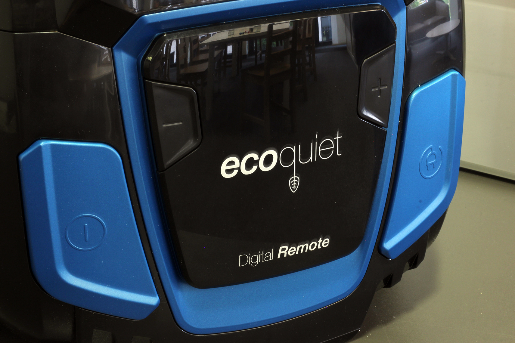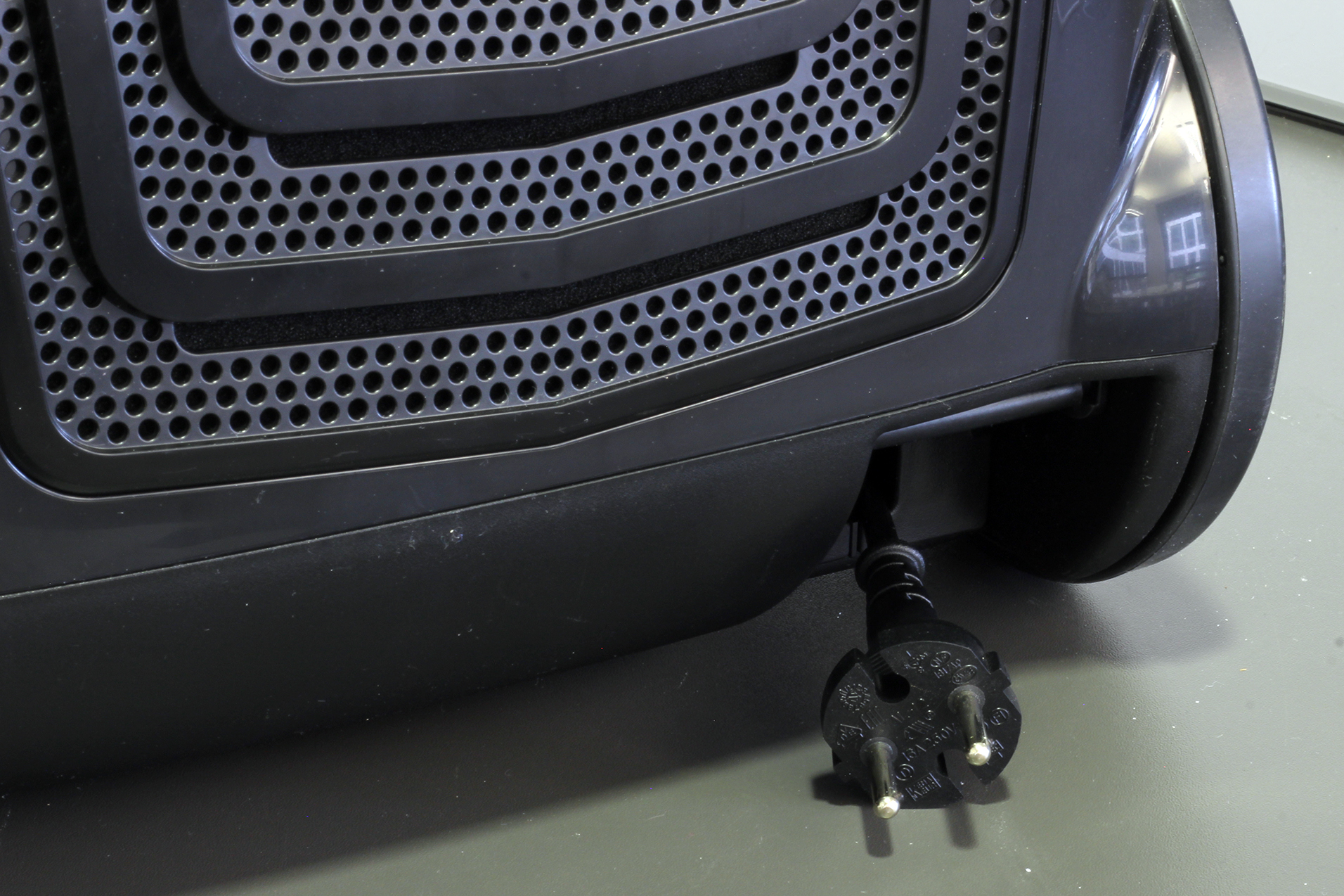 Am Gehäuse selbst befinden sich die Power-Taste und der Knopf für den mechanischen Kabeleinzug. Die Bedienelemente sind identisch geformt und überzeugen durch eine große Fläche. Damit betätigt der Hausmann oder die Hausfrau sie komfortabel mit dem Fuß. Hinzu kommen zwei Tasten zur Programmauswahl. Die gewählte Saugstufe erscheint zusammen mit dem Symbol für den empfohlenen Verwendungszweck auf einem auch von oben gut sichtbaren Display. Die niedrigste Saugleistung ist für Gardinen vorgesehen, die zweite Stufe für Polster, die dritte für Teppich und die Maximalsaugkraft für Hartböden. Da gerade die letzten beiden Symbole nicht ganz eindeutig sind, vermuten wir das zumindest. Auch die Anleitung hilft hier nicht weiter.