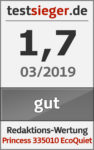 Insgesamt hat uns der Princess EcoQuiet gefallen. Die Verarbeitungsqualität liegt in einem ordentlichen Bereich. Die Bedienung hat uns vor keine Probleme gestellt und die Funktasten am Griff sind ein echtes Highlight. Die Saugleistung muss sich nicht verstecken. Feine und gröbere Verschmutzungen nimmt der Princess auf Teppich- und Hartböden gut auf. Einzig mit sehr großem Schmutz hat die Düse Probleme, wie unser Härtetest mit Kaffeebohnen zeigt. Auf Teppich macht der Staubsauger in puncto Lautstärke seinem Namen alle Ehre. Auf Hartböden steigt die Lärmbelästigung jedoch deutlich an. Die Umwelteigenschaften haben uns gut gefallen. Damit können wir insgesamt eine Kaufempfehlung aussprechen.