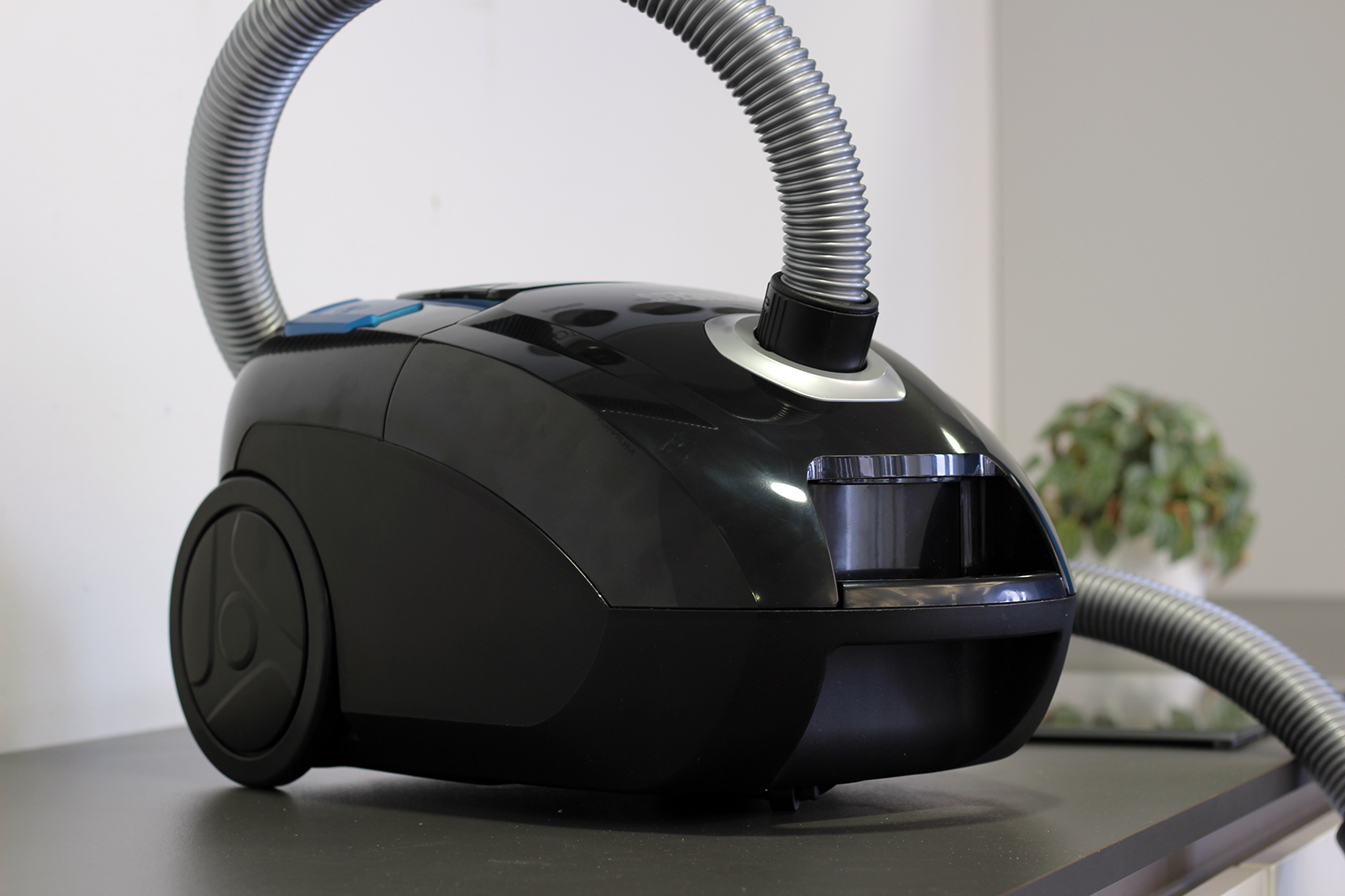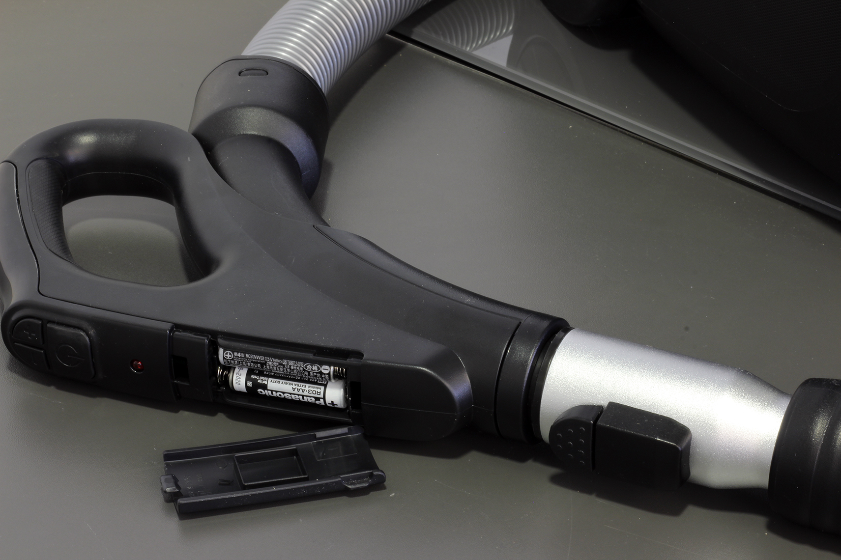 Der Handgriff ist fest mit dem Schlauch verbunden und wartet mit einem echten Highlight auf. Über drei integrierte Bedienelemente, die per Funk mit dem Staubsauger kommunizieren, startet der Nutzer den Staubsauger oder wählt das gewünschte Programm aus. Allerdings sind dafür zwei AAA-Batterien nötig, die im Griff unter einer Abdeckung Platz finden. Das verursacht zwar Mehrkosten, wir empfinden die Funktion allerdings als so praktisch, dass wir diese gerne in Kauf nehmen. Hier muss jeder Nutzer für sich selbst entscheiden.