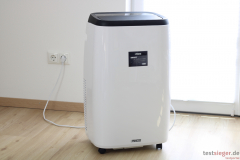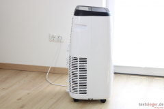 Wir testen die Klimaanlage in einem Dachgeschosszimmer mit einer Größe von 15 Quadratmetern an einem heißen Tag mit bis zu 30 Grad Celsius. Zum Start des Tests messen wir in der Mitte des Zimmers 26 Grad und geben als Zielwert 20 Grad ein. Bereits nach knapp 15 Minuten zeigt unser Temperaturfühler schon 23 Grad an, noch einmal 25 Minuten später ist es im Raum noch einmal ein Grad kälter. Das ist wirklich beachtlich, danach geht es jedoch deutlich gemächlicher. Um die 21 Grad-Marke zu knacken benötigt die Princess knapp 75 weitere Minuten. Ist die Zieltemperatur erreicht, stoppt die Anlage automatisch den Kompressor und geht in den Ventilatorbetrieb über, sollte die Wärme im Raum jedoch wieder steigen, springt auch der Motor wieder an. So schafft sie es die Temperatur recht konstant zu halten.