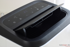 Die Princess 353200 ist dominant in Weiß gehalten und dürfte sich in Kombination mit der schwarzen Oberseite in die meisten Wohnumgebungen gut einfinden. Das ist auch nötig, denn verstecken lässt sie sich mit Abmessungen von 41 Zentimeter in der Breite, 70,5 Zentimeter in der Höhe und 34 Zentimeter in der Tiefe nur schwer. Allerdings besitzt sie damit normale Abmessungen für eine Klimaanlage, schließlich benötigen Wassertank und Kompressor alleine schon ordentlich Platz. Wie bei der Farbwahl setzt Princess auf ein eher zurückhaltendes, schlichtes Äußeres mit klaren Formen. Uns sagt die Optik mit den geschwungenen Kanten zu.