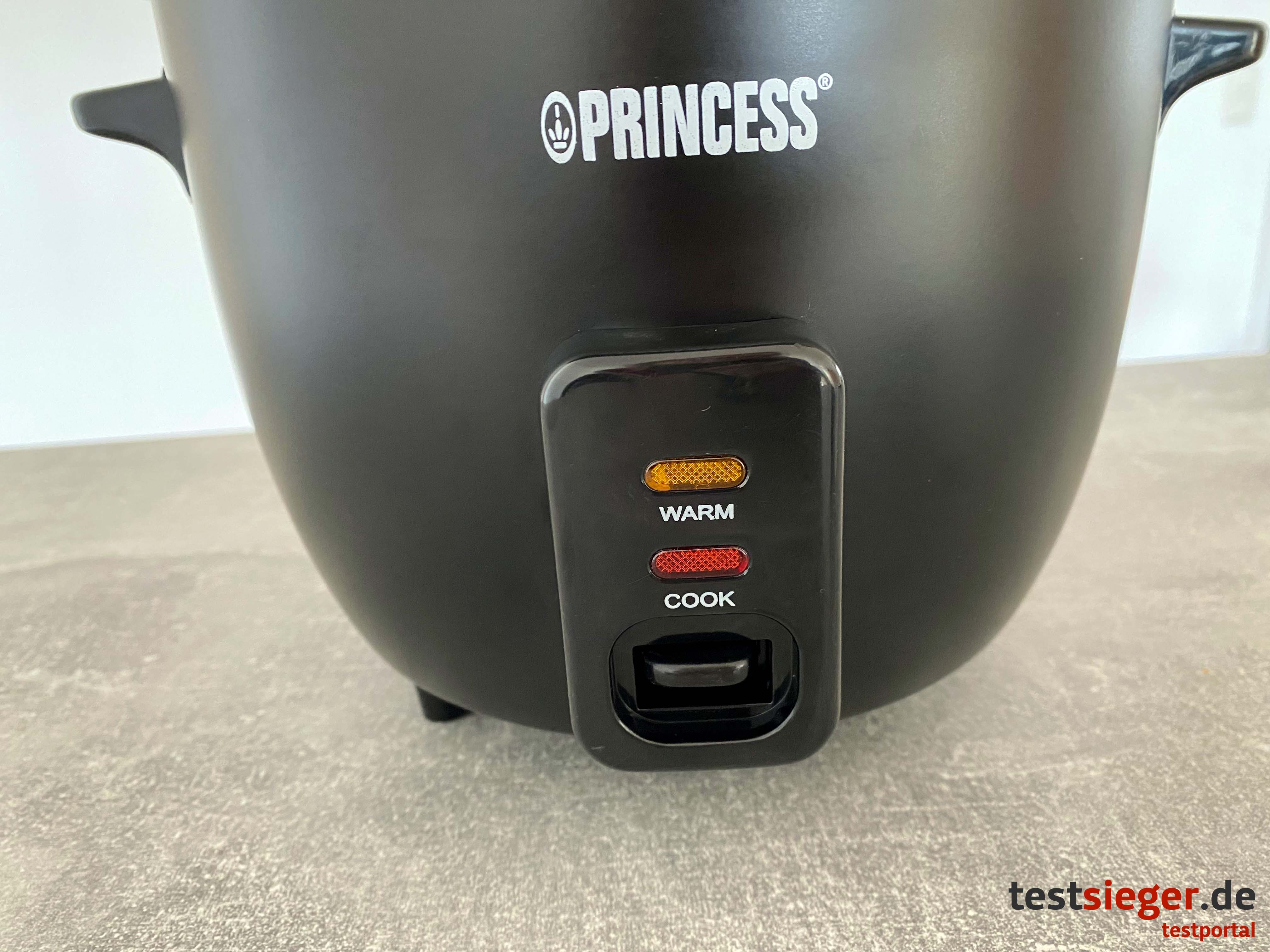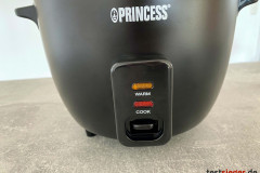 Das Kabel könnte mit 1,1 Metern gerne etwas länger ausfallen. Positiv finden wir, dass dieses abnehmbar ist. Wer möchte, kann das Stromkabel also durch ein längeres ersetzen. Hierfür wird ein Schuko-Kabel in der Ausführung F – CEE 7/4 benötigt. Ein weiterer Vorteil: Beim Verstauen findet das Kabel im Reiskocher Platz. Eine dezidierte Ein- und Ausschaltwippe an der rechten Seite trennt den Princess Reiskocher vom Strom, ohne dass der Nutzer das Kabel aus der Steckdose ziehen muss. Das minimalistische Bedienelement befindet sich auf der Vorderseite des Geräts. Es ist zwar in englischer Sprache beschriftet, bietet aber dennoch kaum Raum für eine Fehlinterpretation. Ein Schalter entscheidet zwischen der Funktion Cook und Warm. Ersteres bringt den Inhalt zum Kochen, letzteres hält ihn nach Zubereitung warm. Ein Lämpchen gibt Aufschluss darüber, in welchem Modus sich der Kocher gerade befindet.