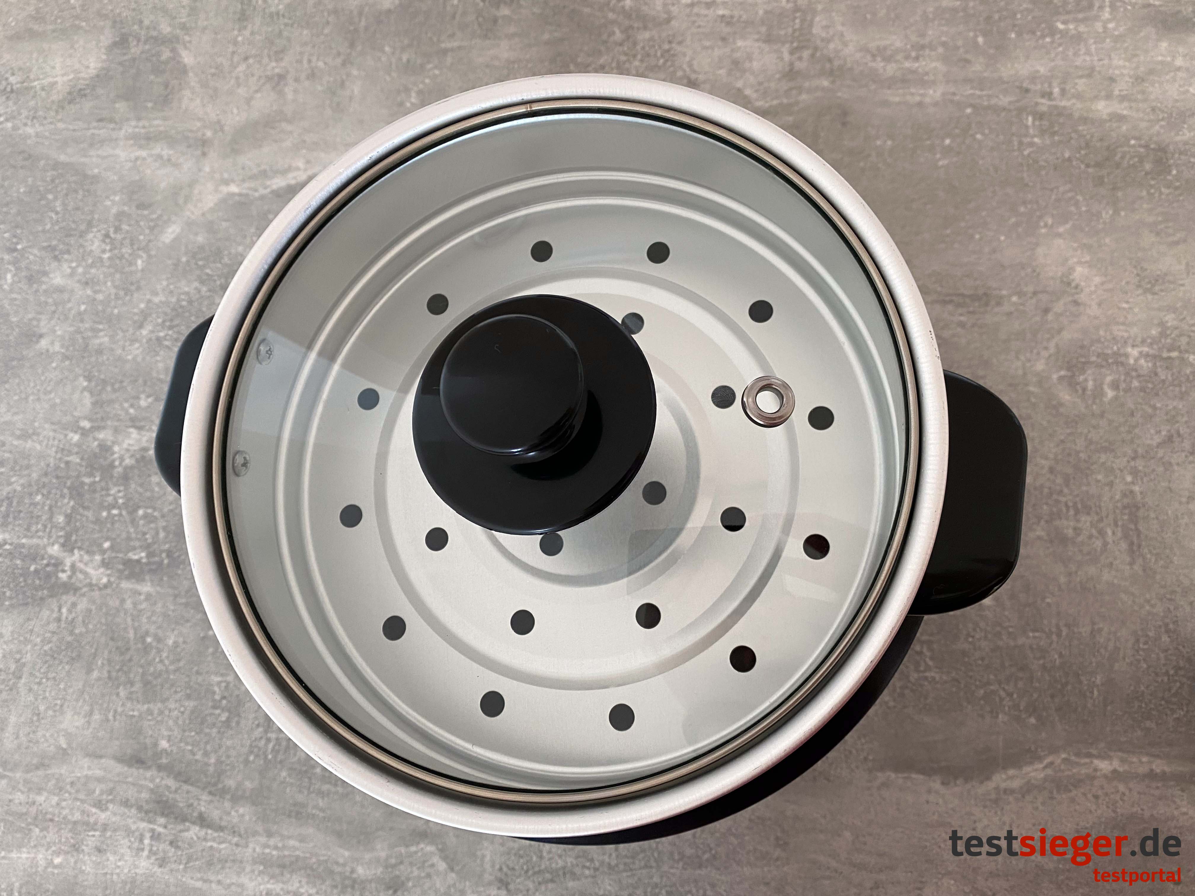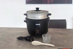 Der Reistopf hat eine Kapazität von einem Liter. Ein Minuspunkt sehen wir in der fehlenden Verankerung. Der Topf dreht frei, was das Umrühren erschwert. Der Nutzer muss den Topf also zwingend festhalten. Der knapp einen Zentimeter breite, überstehende Rand wird allerdings schnell heiß. Wir empfehlen die Verwendung von Topflappen. Das mitgelieferte Zubehör gefällt uns. Im Lieferumfang enthalten sind ein Aufsatz zum Dünsten, ein Plastiklöffel und ein kleiner Messbecher. Ebenso bietet der Reistopf eine Messskala. Hier stimmen jedoch die Angaben aus der Bedienungsanleitung nicht überein. Laut Bedienungsanleitung passt eine Tasse mehr in den Reistopf, als tatsächlich der Fall ist. Wir orientieren uns also an der korrekten Messskala des Topfes.