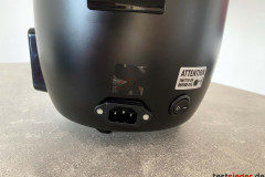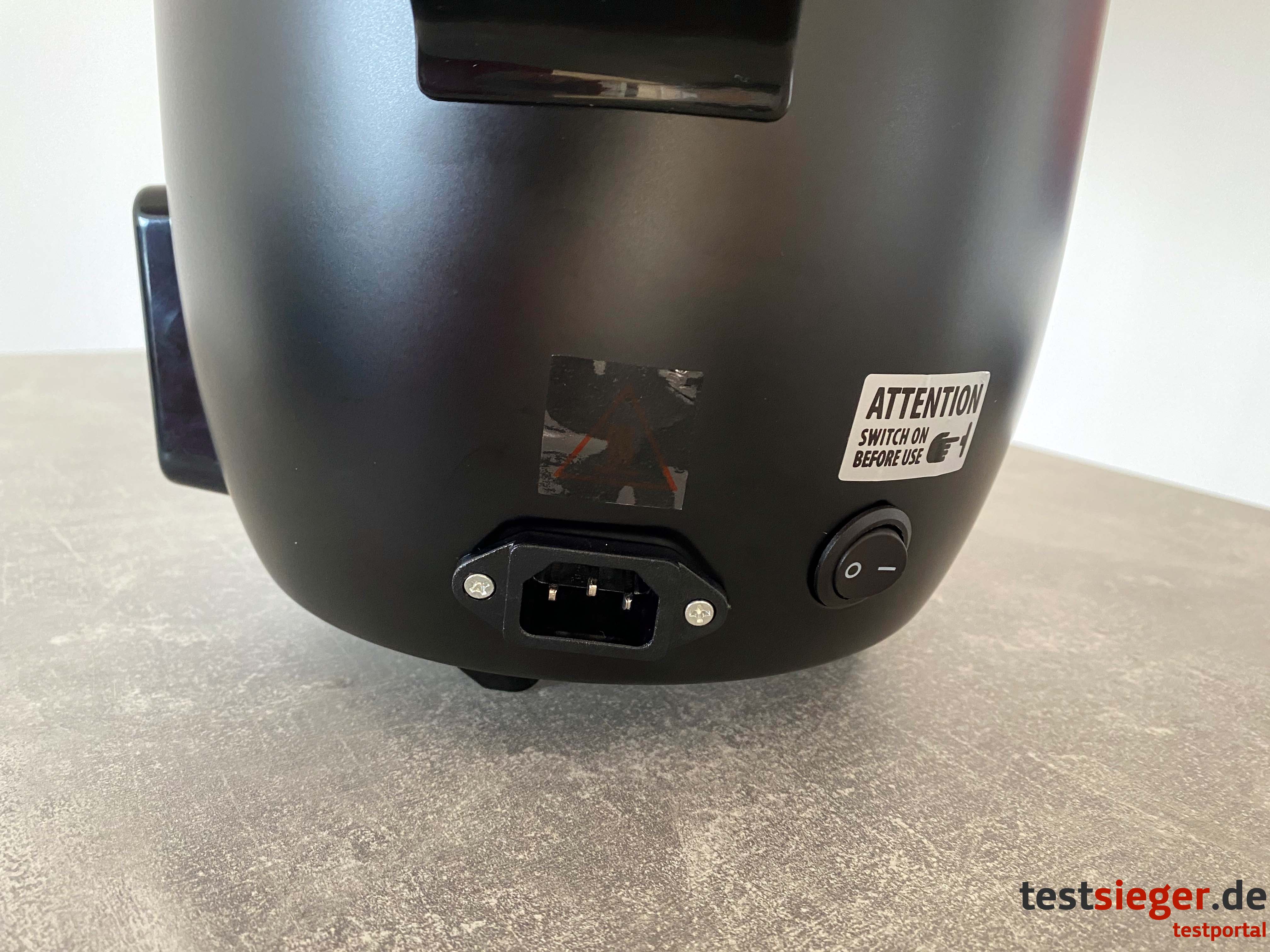 Die einzelnen Komponenten des Küchengeräts wirken hochwertig. Sie lassen sich nicht eindrücken oder verbiegen und überleben einen Sturz problemlos. Allerdings macht das zusammengebaute Konstrukt einen weniger guten Eindruck. Besonders der eingesetzte Reistopf klappert und wackelt. Die Teile lassen sich nur lose ineinanderstecken. Zu Beginn irritiert uns das und wir lesen in der Bedienungsanleitung nach, finden jedoch keinen nützlichen Hinweis. Es existiert kein Schutzmechanismus, der das Gerät bei einem Sturz zusammenhält. Besonders während des Betriebs finden wir das gefährlich. Der Griff am Deckel löst sich durch minimalen Kraftaufwand von der Schraube. Wir fragen uns im Test, ob das vom Hersteller gewollt ist. Zu Reinigungzwecken ist dies sicher praktisch, dennoch haben wir den Verdacht, dass die Haltbarkeit des Griffes dadurch deutlich eingeschränkt ist.