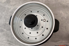 Praktisch finden wir die Antihaftbeschichtung im Reistopf. Sie verhindert das Festkleben des Reises. Die Beschichtung ist jedoch sehr empfindlich – der Hersteller empfiehlt ausschließlich die Verwendung von Kunststoffwerkzeugen. Der Aufsatz ohne Antihaftbeschichtung für Gemüse ist wesentlich robuster. Hier sind spitze Gegenstände kein Problem. Der Glasdeckel liegt bündig auf und bietet ein Luftloch für das Entweichen von Dampf während des Kochens. Drei Füße sollen für Stabilität sorgen. Leider erfüllen sie ihren Zweck nicht, speziell auf Glasuntergrund rutscht der Reiskocher umher. Wir wünschen uns Gummifüße.
