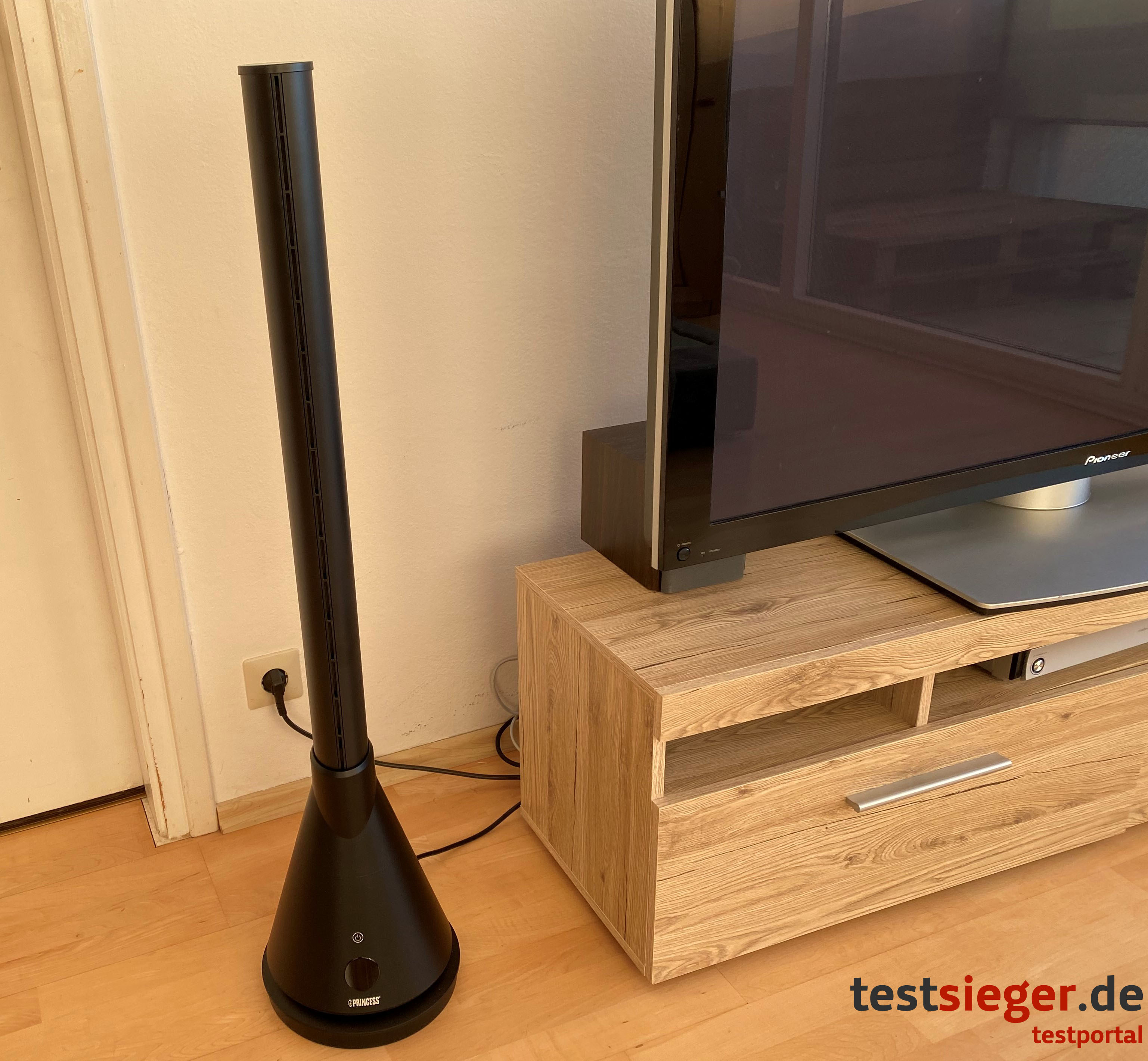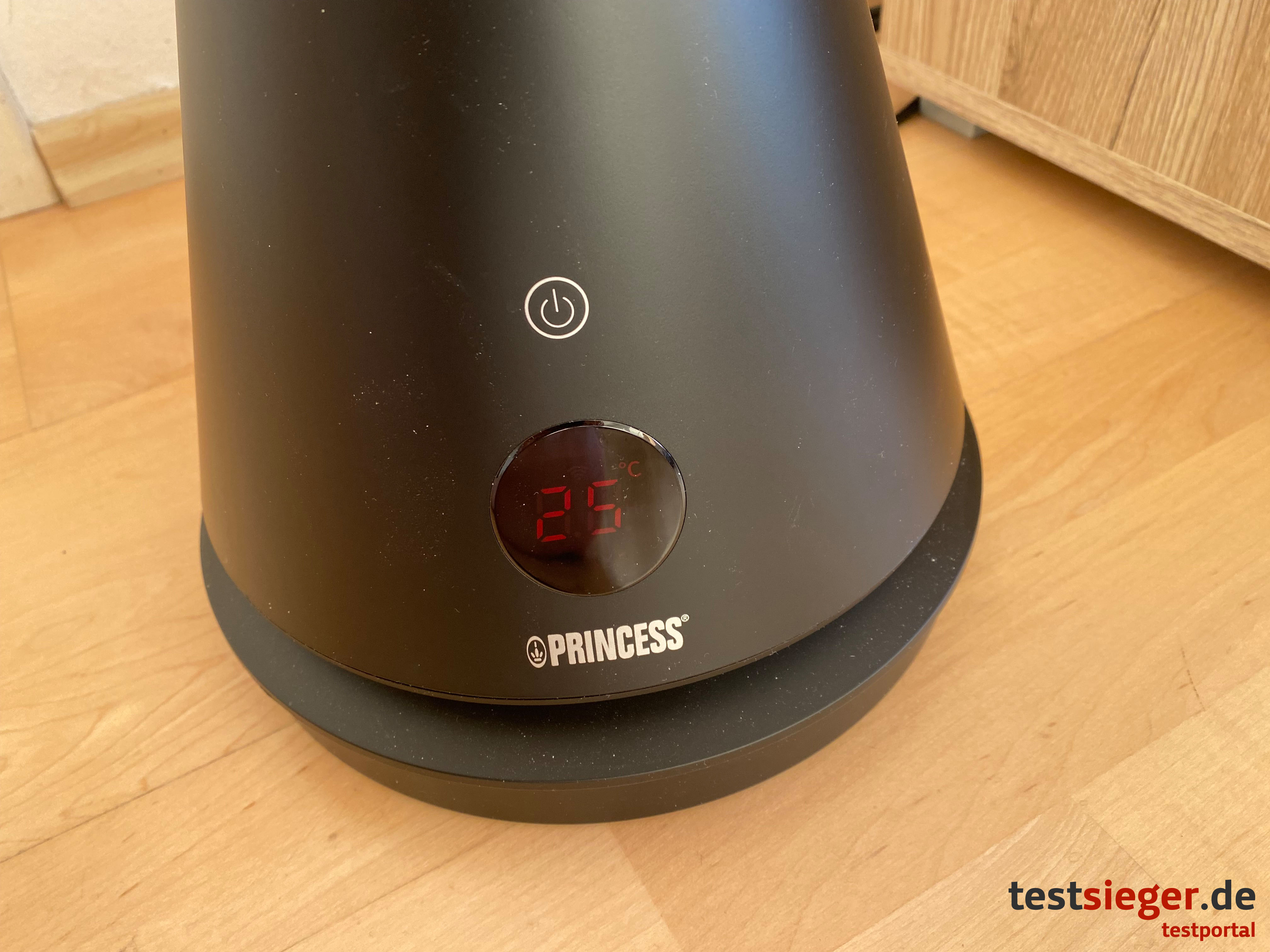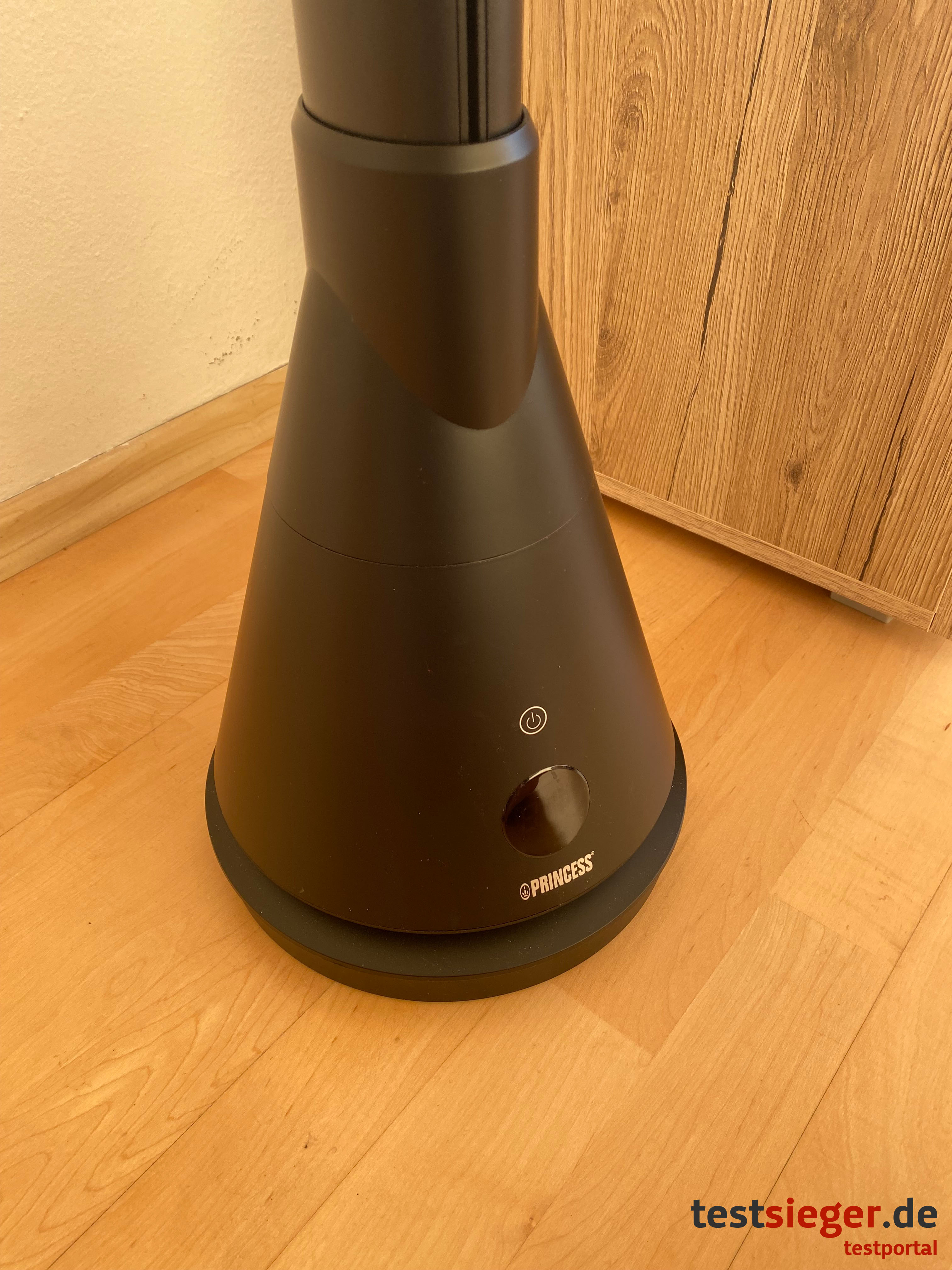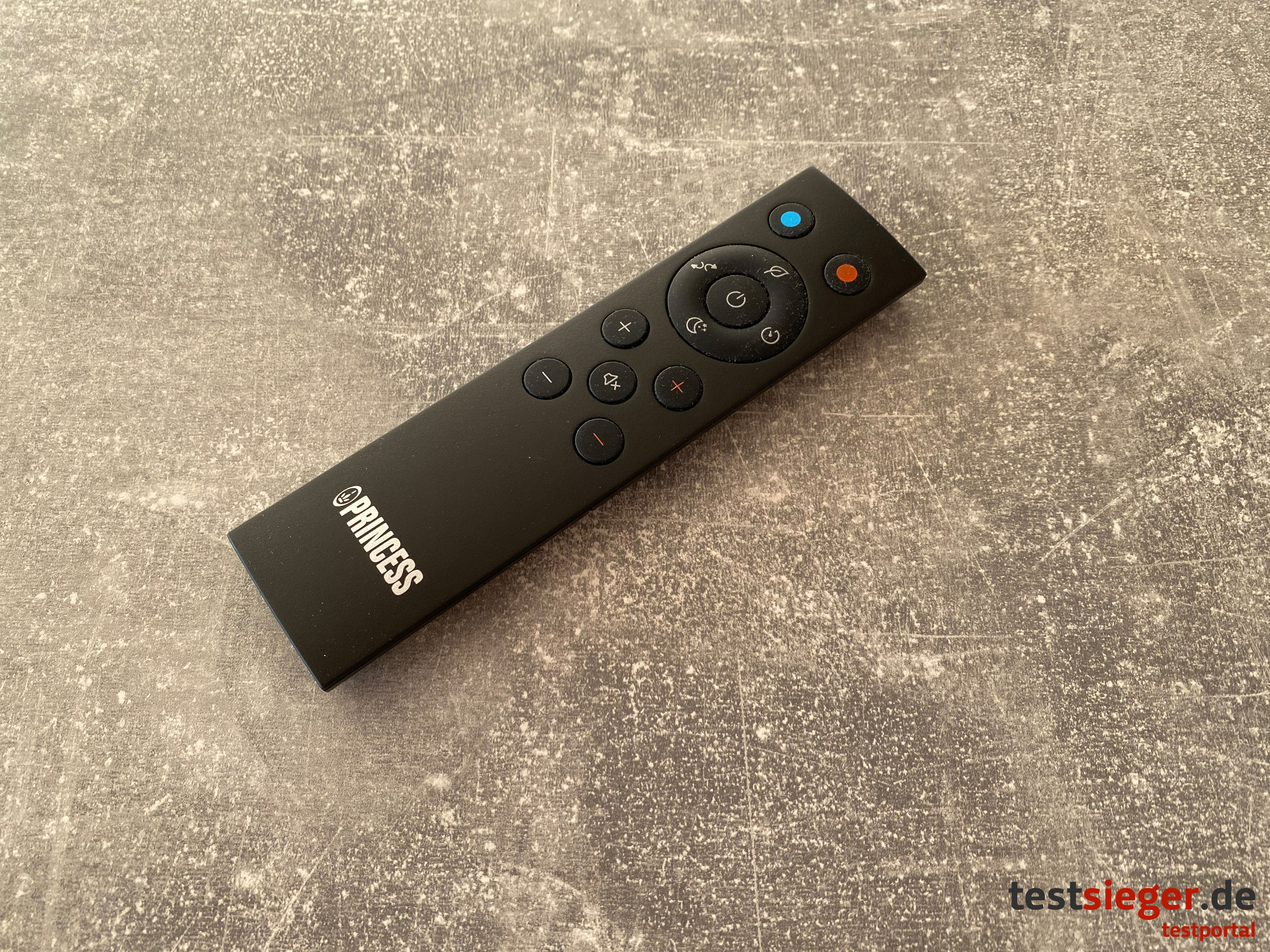 Der Princess Smart Heating & Cooling Tower kommt in komplett mattschwarzem Kunststoff. Das Material wirkt sehr hochwertig und stabil. Mit seinem schlanken Design findet der Tower nahezu überall Platz. Gumminoppen an der Unterseite halten das Gerät auch bei versehentlichem Berühren an Ort und Stelle. Besonders handlich ist der Turm allerdings nicht. Der Heating & Cooling Tower erreicht eine Höhe von ungefähr 100 Zentimetern und eine Breite von rund 23 Zentimetern am unteren Korpus. Nach oben hin wird das Gerät, mit nur noch sechs Zentimetern Breite, schmaler.Im Lieferumfang sind enthalten: der Princess Smart Heating & Cooling Tower, eine Bedienungsanleitung und eine batteriebetriebene Fernbedienung. Die Batterien selbst sind leider nicht im Paket enthalten. Das fällt uns im Test negativ auf, da das Gerät erst mit Fernbedienung einsatzbereit ist. Ein Power-Knopf direkt am Gerät steuert lediglich das An- und Ausschalten. Der Wechsel der verschiedenen Modi erfolgt allerdings ausschließlich über die Fernbedienung oder das Smartphone.Handhabung und Bedienung