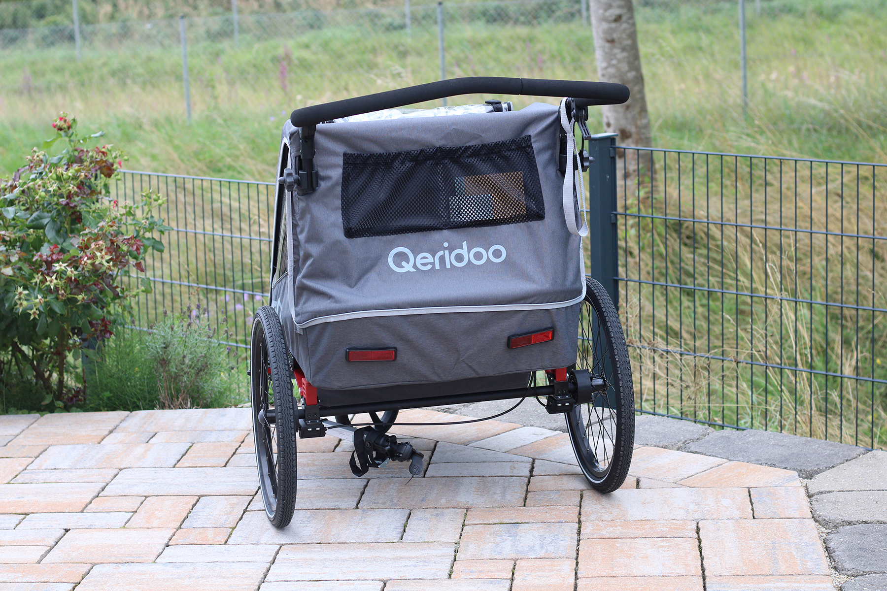 Sein überwiegend dunkelgraues Design verleiht dem Qeridoo QUPA 2 eine zeitgemäß schlichte Optik. Der Zweisitzer ist in den Farben Grau, Blau und Lime erhältlich, die Farbvarianten betreffen aber lediglich die Gummibänder des Verdecks und die Handschlaufe. Der Rest ist bei allen drei Optionen in einem dunklen Grau gehalten. Somit erscheint der Buggy insgesamt recht unaufdringlich. Lime und Blau setzen aber trotzdem deutlich Farbtupfer, hier ist der QUPA 2 auch bei schlechtem Licht am besten zu erkennen. Für die bessere Sichtbarkeit im Straßenverkehr verfügt der Fahrradanhänger über zusätzliche Reflektorlinien auf dem Bezug, den Rädern und den Radabweisern. Für einen Zweisitzer ist der Qeridoo recht kompakt: Mit einer Breite von rund 78 Zentimetern, einer Höhe von 98,5 Zentimetern und einer Tiefe von fast 108 Zentimetern (mit ausgeklapptem Schieber) braucht er aber natürlich trotzdem einiges an Platz. Das Gewicht von etwa 15 Kilogramm ist dafür vergleichsweise leicht, was besonders beim Radfahren und Schieben von Vorteil ist.