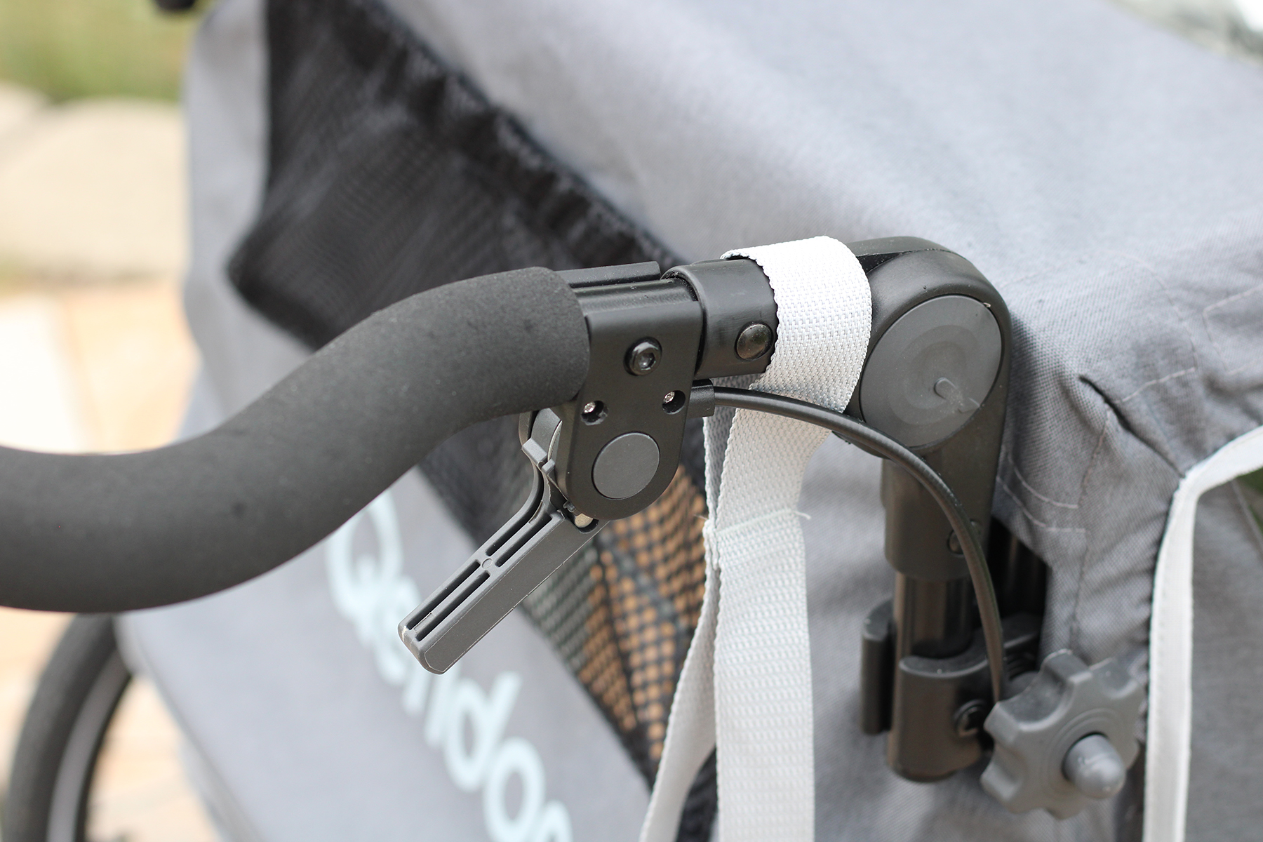 Der verstellbare Schiebegriff kann mithilfe von zwei seitlichen Knöpfen um 270 Grad gedreht werden und lässt sich bei Nichtgebrauch platzsparend kippen. Beim Fahrrad-Einsatz sollten Nutzerinnen und Nutzer den Griff nach vorne klappen, dann bietet er als Überrollbügel zusätzlichen Schutz. Eine Hebelbremse am rechten Griff bietet in der zweiten Rastposition optimalen Halt. Zum Lösen genügt ein Knopfdruck, und der Buggy rollt wieder mühelos.
