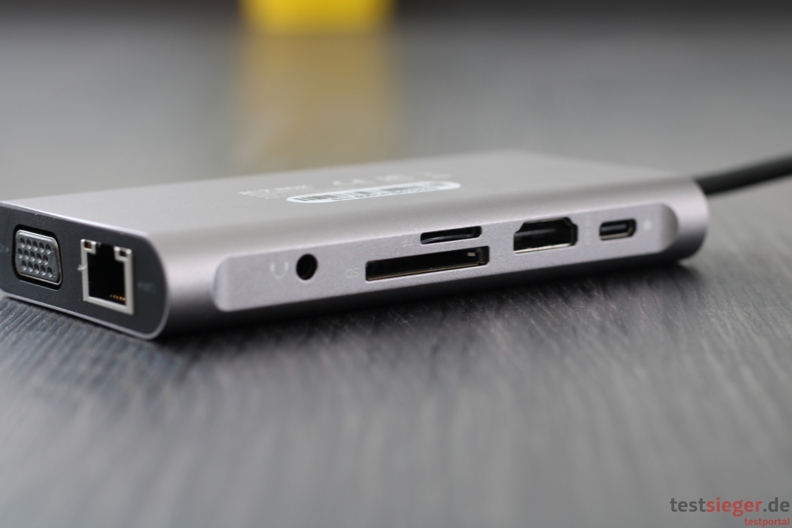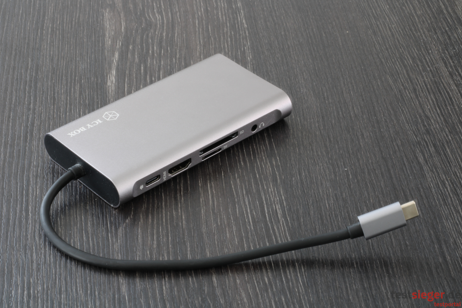 Die Rückseite bietet schlussendlich noch einen Ultra-HD-tauglichen HDMI-Anschluss, eine 3,5-mm-Audioaugang, einen SD- und einen MicroSD-Kartenschacht. Wer möchte kann per HDMI und VGA auch zwei Monitore parallel verbinden, muss dann allerdings mit der niedrigeren Full-HD-Auflösung leben. Hinzu kommt ein weiterer USB-C-Anschluss, der den Power-Delivery-Standard bis zu 60 Watt unterstützt. Ist der Ladeanschluss am Rechner also durch die Dockingstation besetzt, verbindet der Nutzer das Stromkabel einfach mit der ICY BOX. Zur Datenübertragung ist die Schnittstelle nicht geeignet. Es ist also auch nicht möglich eine zweite USB-Dockingstation zu verbinden. Im Dauerbetrieb stellen wir eine deutliche Wärmeentwicklung fest, diese überschreitet jedoch nie kritische Werte.