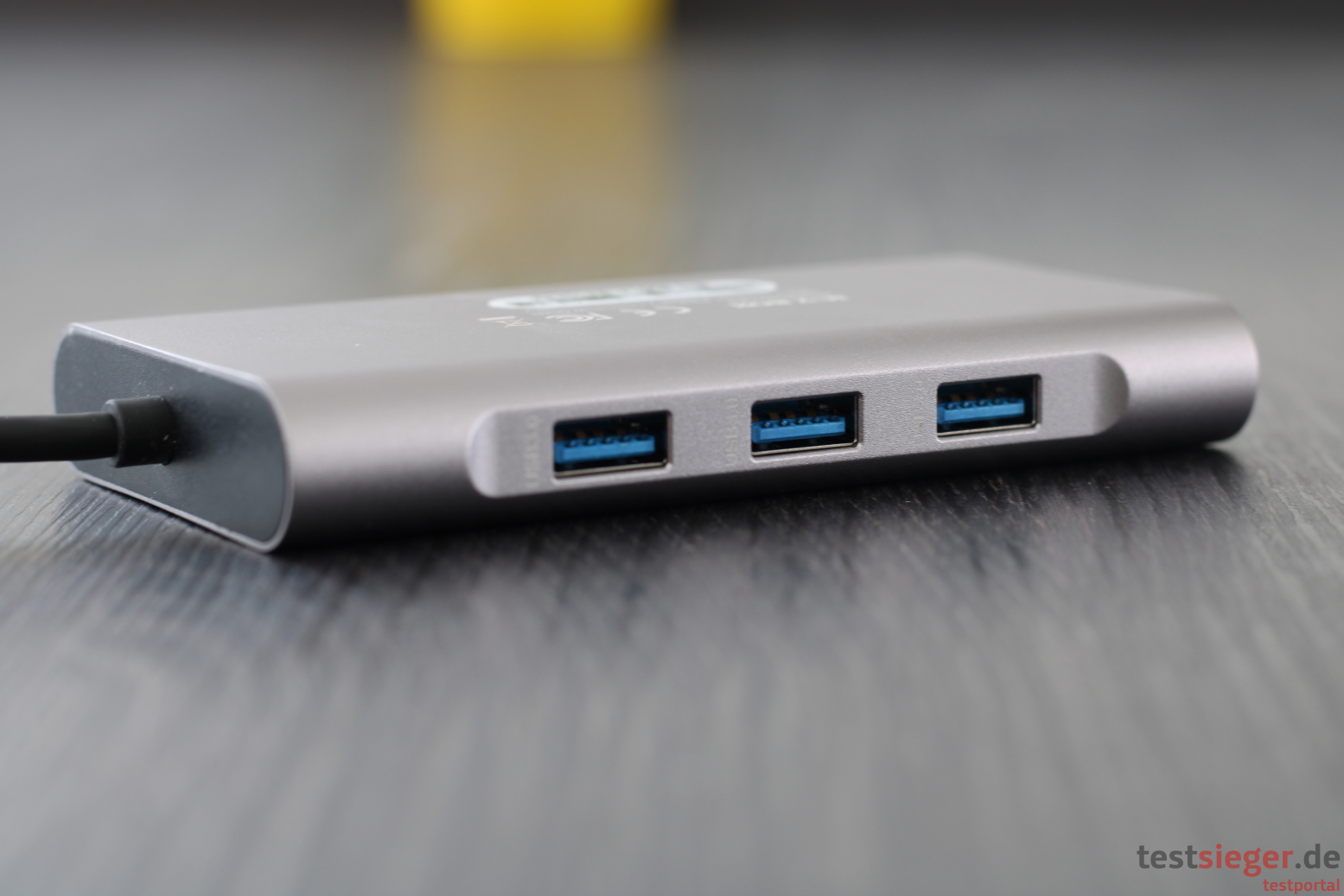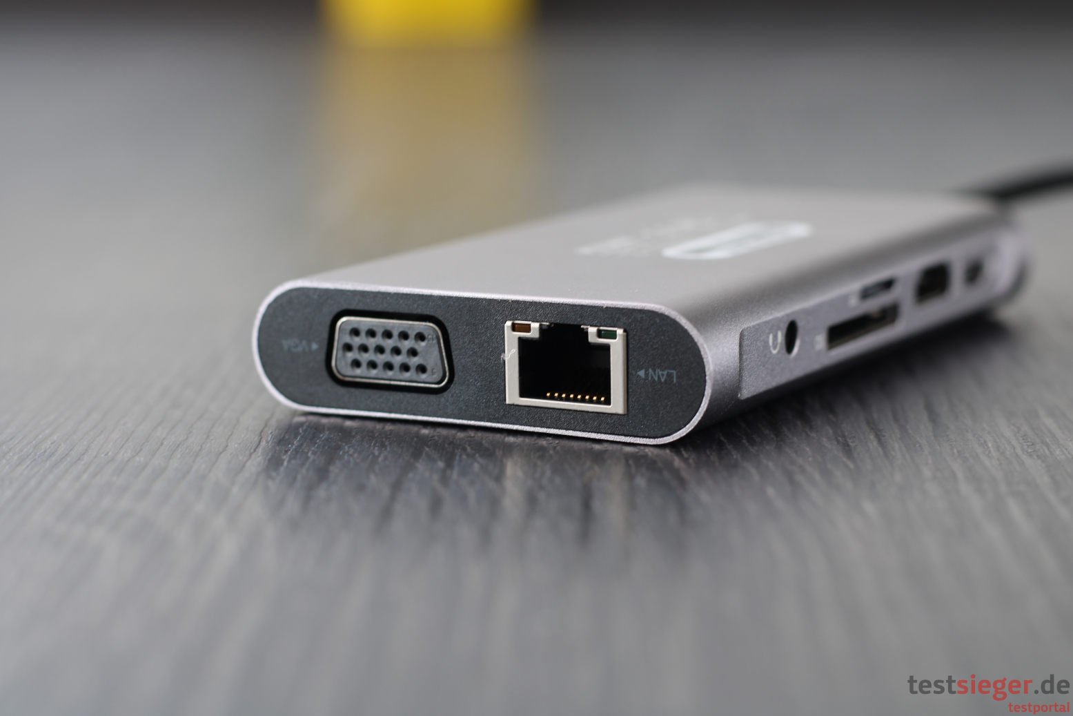 Die Anschlussvielfalt ist gerade in Anbetracht der kompakten Abmessungen beeindruckend. Der Vorderseite hat RaidSonic direkt drei USB-3.0-Schnittstellen spendiert, die allesamt Übertragungsraten von bis zu fünf Gbit/s liefern sollen. Das können wir im Praxistest in etwa bestätigen auch wenn die Maximalgeschwindigkeit natürlich von verschiedenen Faktoren abhängt und nur selten erreicht wird. An der Seite findet sich neben einem VGA-Videoausgang auch noch eine Ethernet-Schnittstelle. Letztere ist besonders praktisch, schließlich sparen Notebookhersteller diese heutzutage gerne weg. Die Verbindung zum Monitor beziehungsweise dem heimischen Netzwerk klappt reibungslos und die Anschlüsse arbeiten vorbildlich.