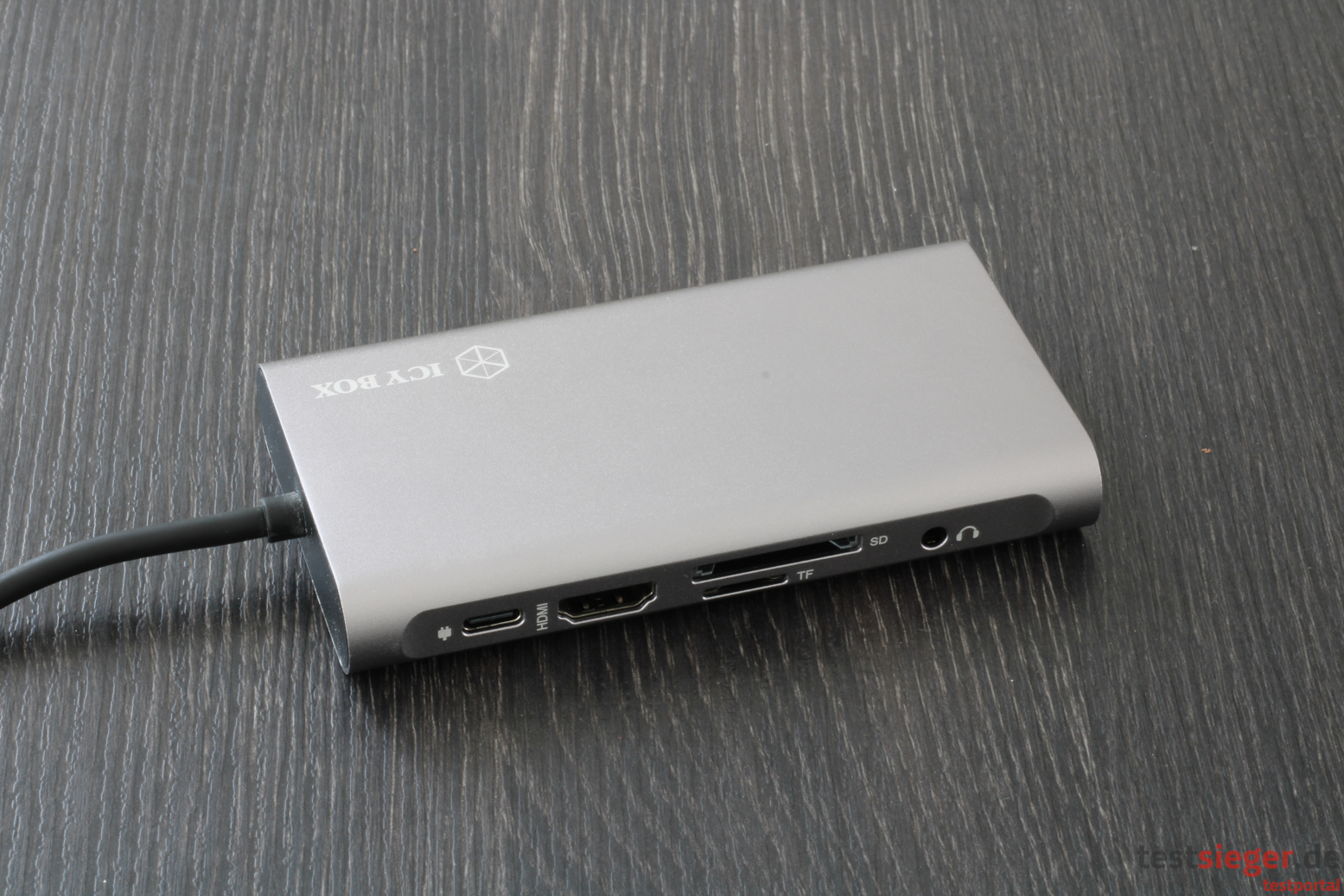 Mit einer Breite von 11,5 Zentimetern, einer Tiefe von 7,2 Zentimetern und einer Höhe von 1,6 Zentimetern gehört die Station definitiv zur kompakteren Sorte. Das ist vor allem in Anbetracht der reichhaltigen Anschlussmöglichkeiten beeindruckend. RaidSonic hat sich im Gegensatz zu den meisten anderen hauseigenen Dockingstations allerdings gegen eine keilförmige Bauweise entschieden. Damit kann der Nutzer das Gerät im Zweifel nicht unter den Laptop schicken, wenn beispielsweise in der Bahn Platzmangel herrscht. Gummierte Standfüße sind nicht vorhanden, was zu einem recht unsicheren Halt vor allem auf glatten Oberflächen führt. Da die Station aber fest mit dem Notebook verbunden ist, muss der Nutzer trotzdem keine Angst haben, sie könnte auf den Boden flutschen.