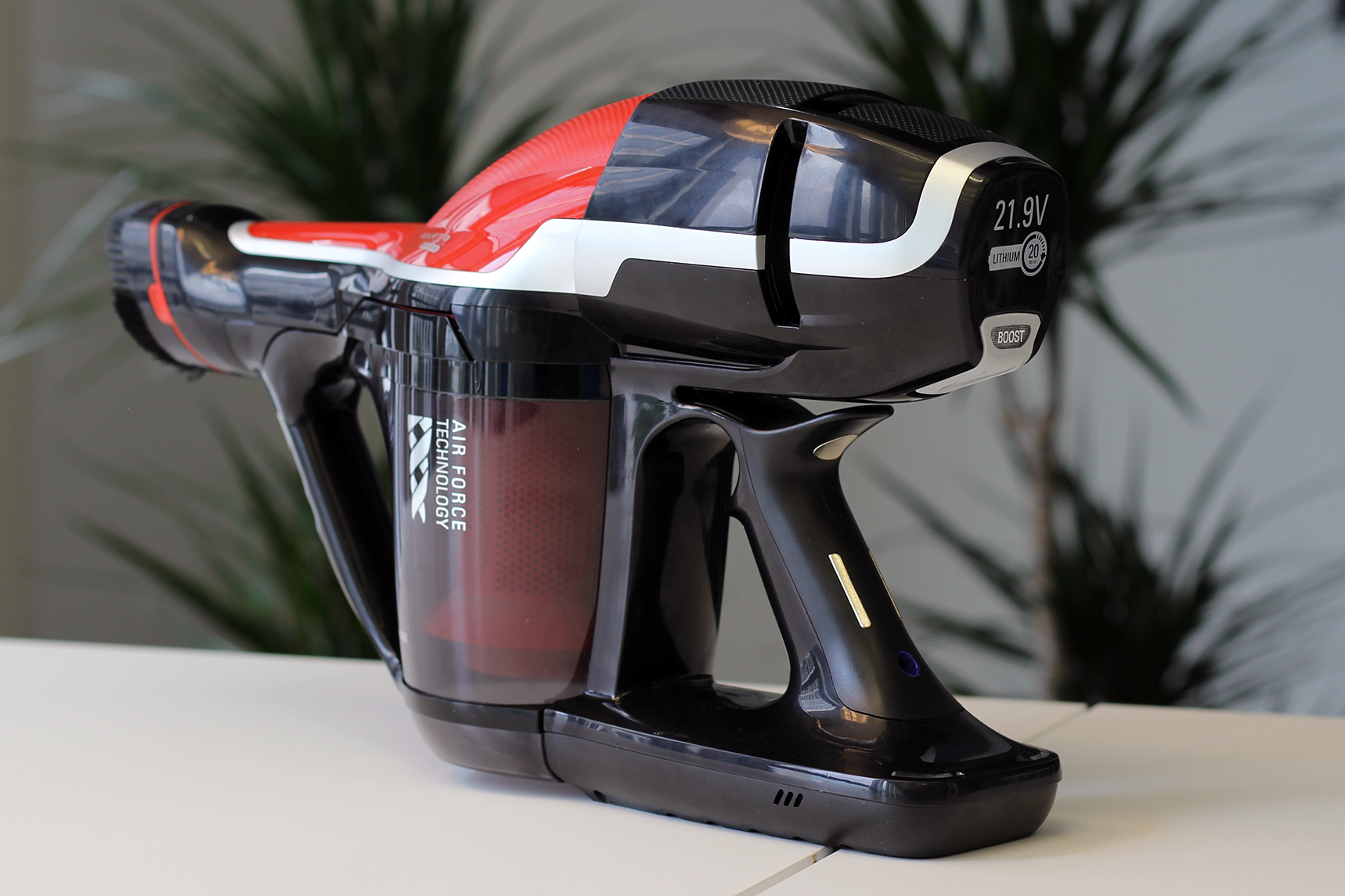 Die Bedienung geht sehr einfach von der Hand. Die Starttaste befindet sich am Pistolengriff und muss dank der Einrastfunktion nicht durchgängig gehalten werden. Das schont die Finger und erleichtert den Dauerbetrieb. Die Taste hat einen angenehmen Druckpunkt und rastet sehr leicht ein und wieder aus. Allerdings muss man etwas aufpassen, dass man sich nicht die Haut im während des Drückens entstehenden Hohlraum einklemmt. An der Hinterseite der Motoreinheit befindet sich die Boost-Taste, um noch mehr Leistung aus dem Gerät herauszuholen. Diese lässt sich problemlos mit dem Daumen der Griffhand erreichen, wodurch der Nutzer für den kompletten Saugvorgang nur eine Hand benötigt. Dank des angenehmen Schwerpunkts kann der Air Force 460 auch zum Saugen an der Decke verwendet werden. Allerdings ist es nicht ganz einfach, den Staubsauger mit nur einer Hand nach oben zu wuchten. Weil es mit zwei Armen deutlich einfacher funktioniert, hat Rowenta der Motoreinheit einen weiteren Griff spendiert. Da dieser im Vergleich zum Hauptgriff nicht viel Freiraum für den Handballen bietet, lässt er sich nicht ganz so komfortabel verwenden.