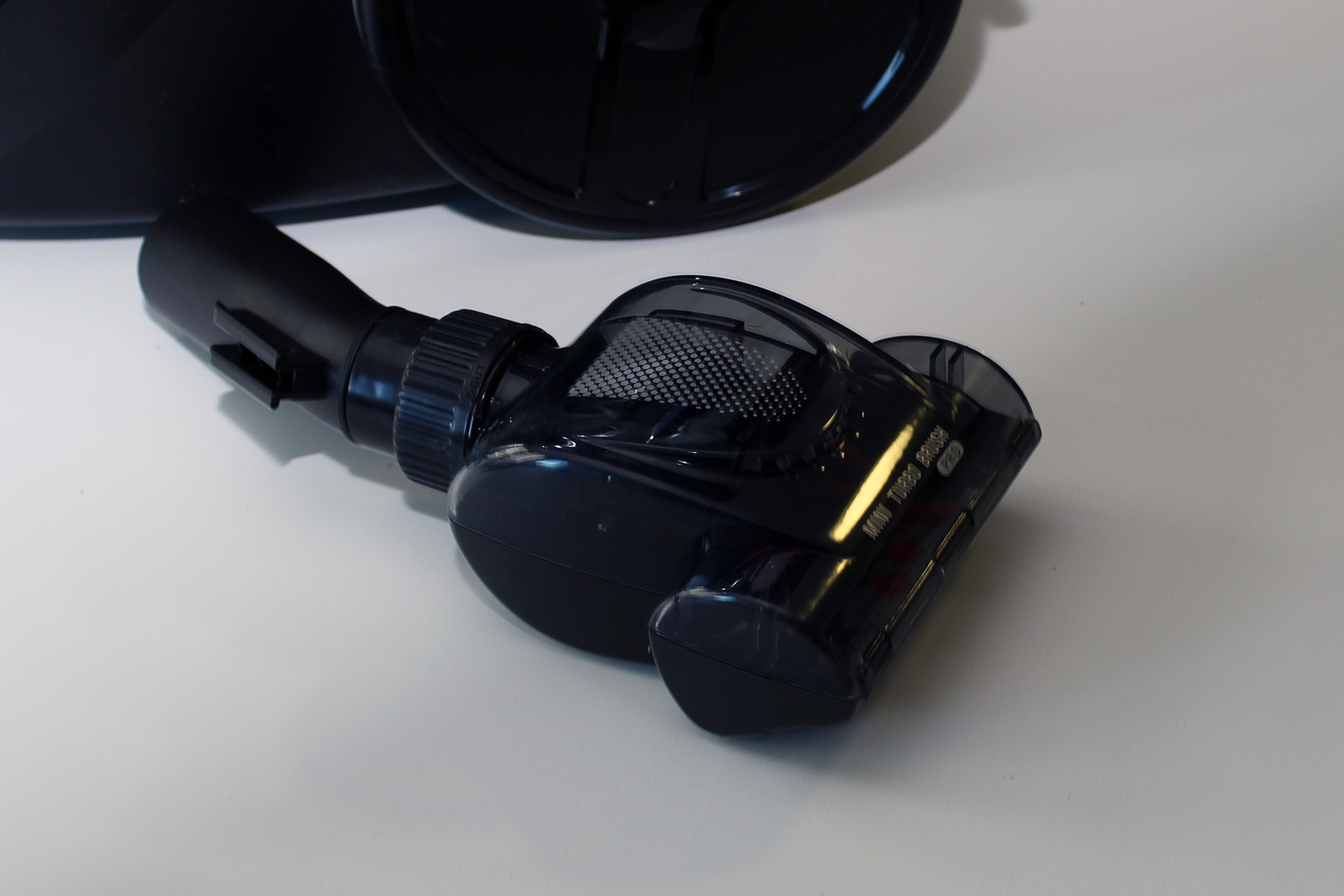 Der Handgriff ist fest am Schlauch montiert und verfügt praktischerweise über eine integrierte, herausfahrbare Möbelbürste.
