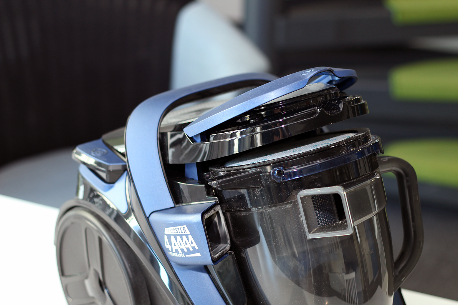 Der Rowenta RO7681EA verwendet zwei Staubfilter – einen Schaumstofffilter vor dem Motor und einen Flachfaltenfilter. Die Kombination aus den beiden Systemen ergibt eine saubere Abluft, was auch die bestmögliche Staubemissionsklasse A zeigt. Der Staubbehälter fasst 2,5 Liter und erinnert an einen großen Messbecher. Zum Entnehmen muss der Nutzer zunächst einen Hebel an der Oberseite öffnen. Dann lässt sich der Behälter einfach herausnehmen. Allerdings kommt man immer mit Staub in Berührung, weshalb die Hygieneeigenschaften nicht optimal sind.