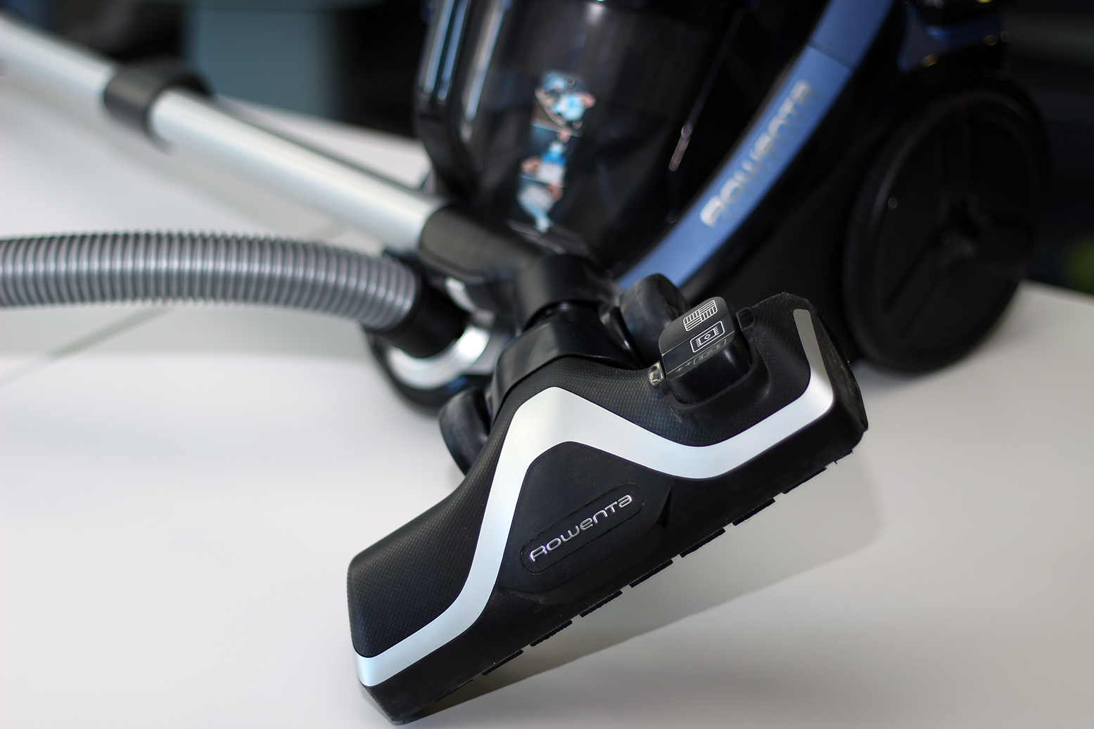 Im Lieferumfang befindet sich eine Universalbürste namens Power Glide, die sich sowohl für Parkett als auch für Fliesen und Teppich eignet. Über eine Tritttaste an der Düse lässt sich zwischen der Verwendung auf Hart- oder Teppichboden umschalten. Für starke Verschmutzungen auf Langflor-Teppichen ist eine dritte Option wählbar. Darüber hinaus hat Rowenta dem RO7681EA weiteres Zubehör spendiert. Hier sticht vor allem die Maxi-Turbobürste hervor, die mit ihren langen, rotierenden Borsten in erster Linie für Tierhaare auf Teppich geeignet ist. Eine kompaktere Variante der Turbobürste für Möbel befindet sich ebenfalls im Lieferumfang. Abgerundet wird das umfangreiche Gesamtpaket durch eine Parkettdüse, eine Fugendüse und eine Sofabürste.