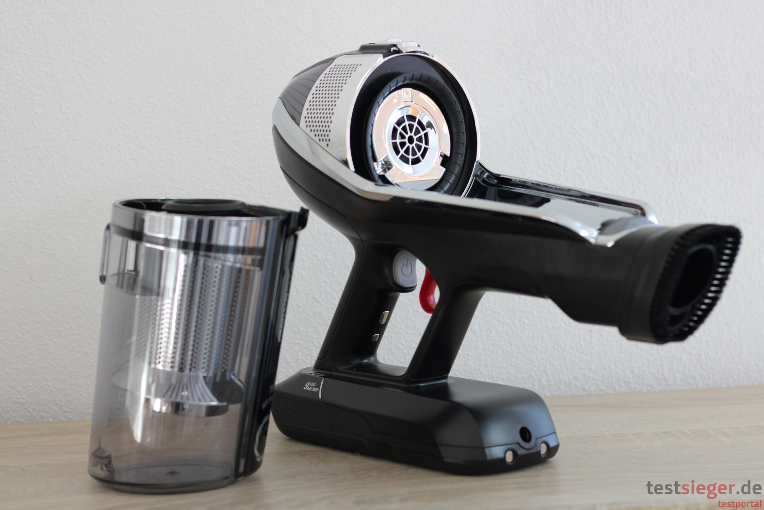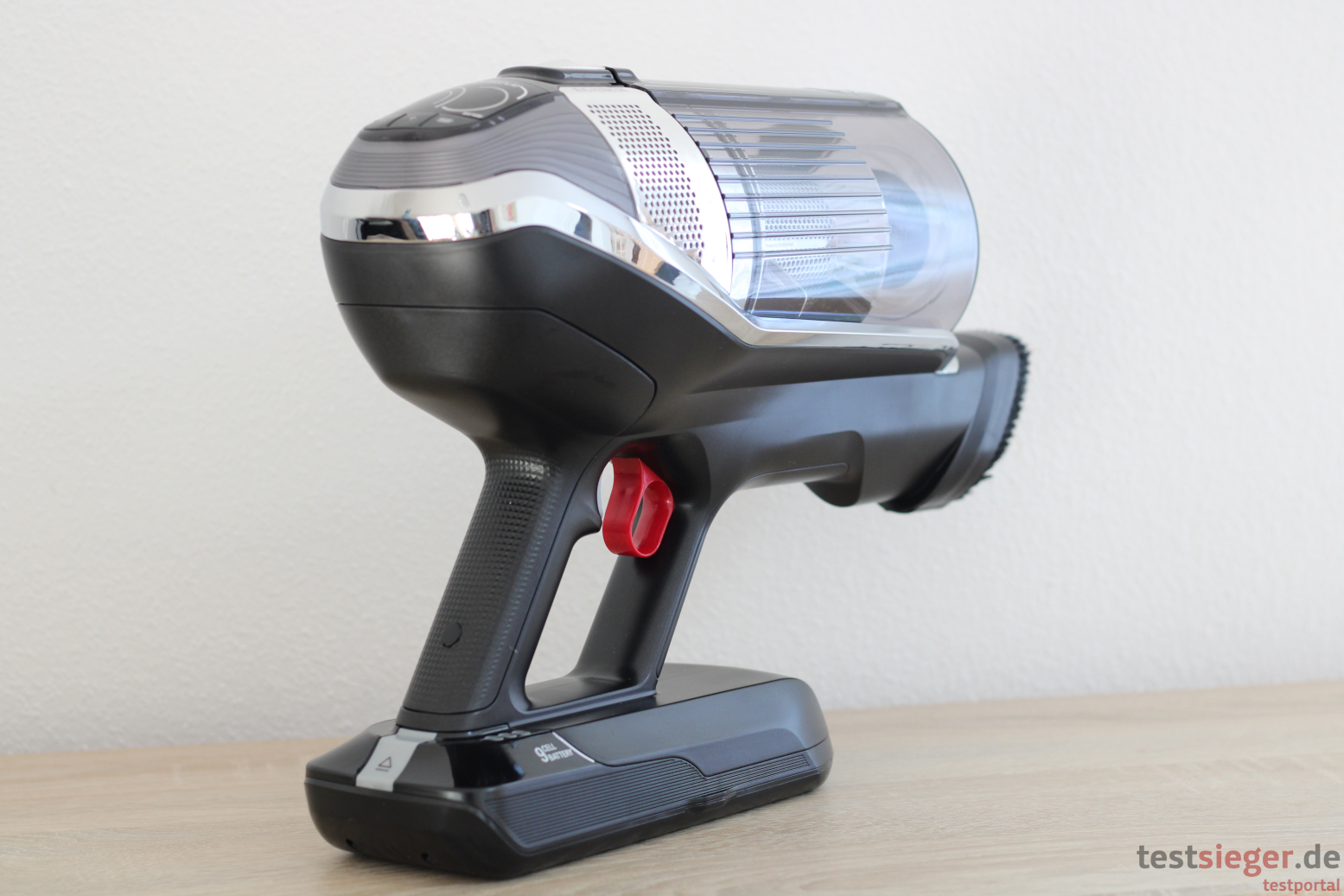 Die Bedienung bereitet uns im Praxistest keine Probleme. Sie ist intuitiv und selbst ohne die beiliegende Anleitung schnell erlernt. Das Begleitheft ist nur bebildert, die Illustrationen sind jedoch recht eindeutig. Trotzdem hätten wir uns für ein perfektes Verständnis der verschiedenen Funktionen noch einen erklärenden Text gewünscht. Am Griff befindet sich die Power-Taste. Diese lässt sich selbst mit kleinen Fingern angenehm erreichen und betätigen. Allerdings reagiert sie nicht immer beim ersten Mal. Es kommt während dem Test doch häufiger vor, dass wir die Eingabe wiederholen müssen. Das kann durchaus einmal vorkommen, doch in dieser Häufigkeit müssen wir ein paar Punkte abziehen. Dagegen sehr schön: Der Knopf rastet fest ein und Nutzerinnen und Nutzer müssen ihn nicht gedrückt halten. Gerade im Dauerbetrieb eine echte Wohltat für die Finger. Direkt vor der Starttaste befindet sich der Boost-Hebel. Wir haben hier ebenfalls keine Probleme, diesen mit dem Zeigefinger leicht nach hinten zu ziehen, um die höchste Leistungsstufe zu zünden. Beim Loslassen geht der Sauger sofort wieder in den Normalzustand über. Das ist sinnvoll, da der Boost sehr stark am Akku saugt und deshalb nur punktuell zum Einsatz kommen kann.