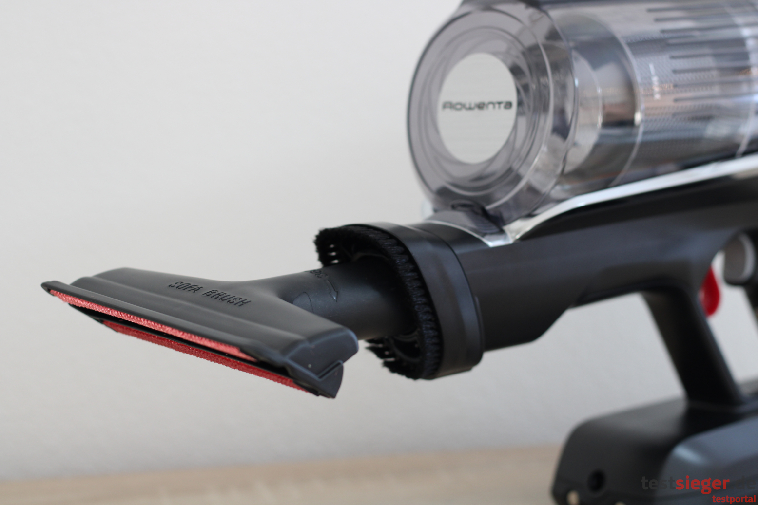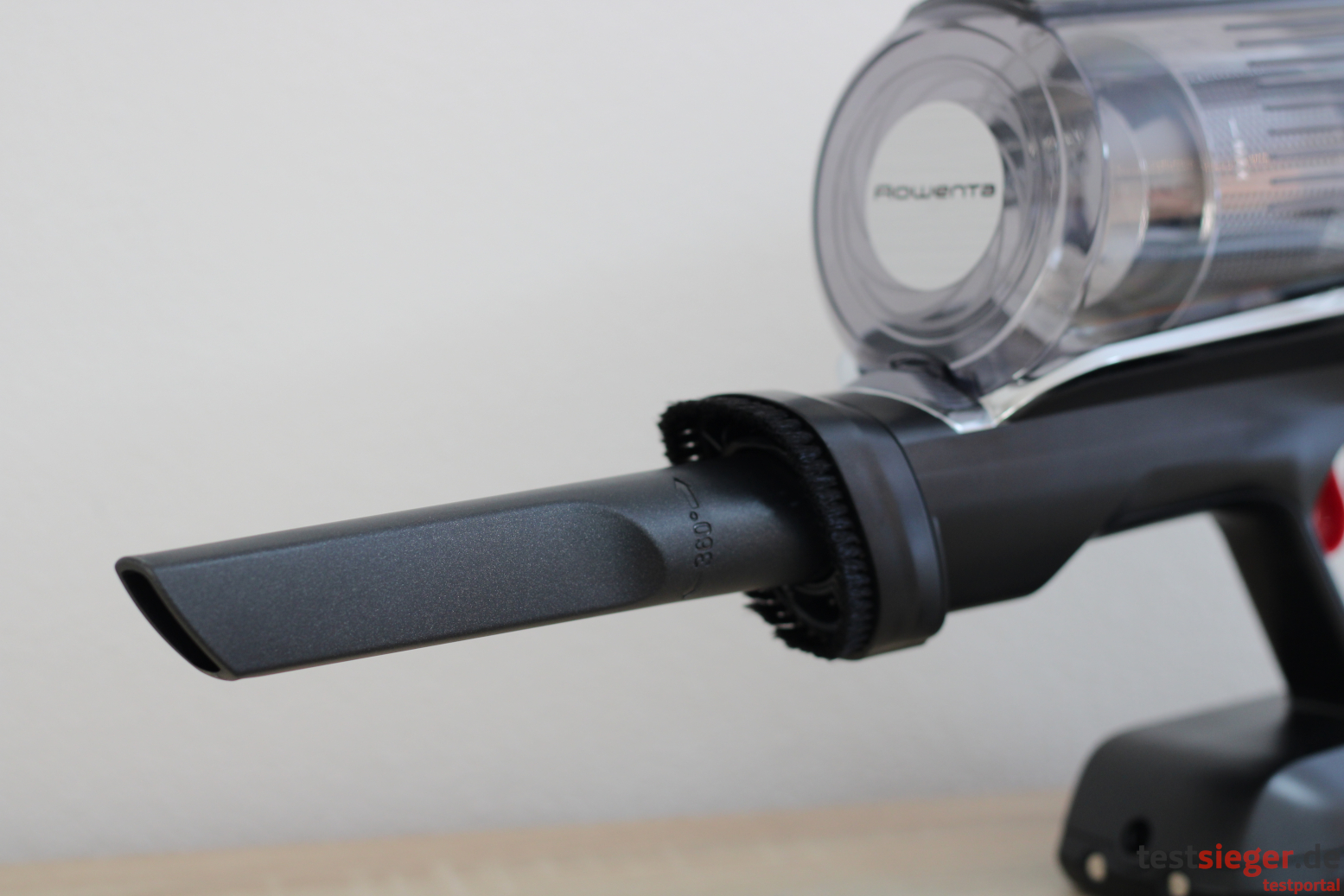 Den Zusatz Animal verdankt der X-Force Flex 14.60 der kleinen beiliegenden Zusatzbürste. Diese ist ebenfalls elektrisch und soll vor allem Tierhaaren den Kampf ansagen. Das können wir im Praxistest bestätigen. Die Bürste funktioniert gut und schafft bei Tierverschmutzungen schnell Abhilfe. Natürlich lässt sich der Rowenta auch als Handstaubsauger verwenden. In der Verpackung liegen zusätzlich noch eine Polster- und eine Fugendüse. Beide erzielen in unserem Test gute Ergebnisse. Die beiden Einsätze lassen sich im Gewinde um 360 Grad drehen. Praktisch, wenn Nutzerinnen und Nutzer zum Beispiel an den Seiten einer Couch oder an der Decke saugen müssen.