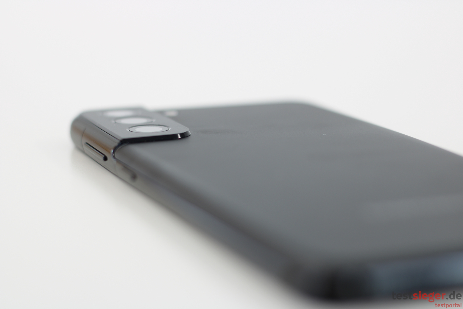 Die Optik eines Smartphones ist natürlich Geschmackssache, unseren trifft Samsung mit dem S21+ aber voll. Wie bei den anderen Modellen der Serie liegt das vor allem am innovativen Kameragehäuse. Dieses geht nahtlos in den Rahmen über und verleiht dem Handy eine verspielte Eleganz – auf jeden Fall ein Hingucker. Dabei ist die Triple-Kamera zwar minimal vom restlichen Gehäuse abgesetzt, was jedoch nicht weiter Schlimm ist und den optischen Eindruck sogar noch einmal unterstreicht. Gerade bei der von uns getesteten schwarzen Farbvariante könnte der Effekt sonst schnell untergehen. Wer es lieber etwas auffälliger mag, entscheidet sich für die silberfarbene oder violette Ausführung.