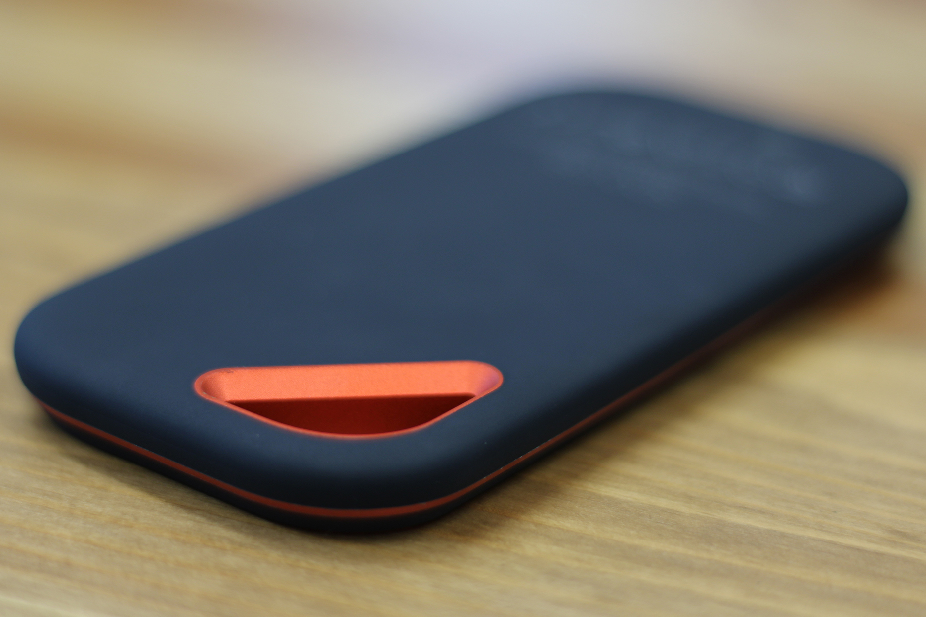 Die SanDisk Extreme Pro Portable SSD ist, wie der Name schon vermuten lässt, auch für den mobilen Einsatz vorgesehen. Daher erweist sich auch das Gehäuse als entsprechend robust. Unter der gummierten Oberfläche befindet sich ein Aluminiumgehäuse, das an einem Streifen an der Seite und an der Karabineröse optisch ansprechend in glänzendem Rot durchscheint. Unsere Falltests aus ein bis zwei Metern Höhe übersteht die SanDisk Extreme Pro folgerichtig unbeschadet. Das robuste Gehäuse schützt das fragile Innenleben hervorragend. Aber auch davon abgesehen hinterlässt die Verarbeitungsqualität keinen Anlass zur Kritik. Die verschiedenen Komponenten sind sauber miteinander verbunden und gehen ohne nennenswerte Abstufungen ineinander über. Auffällig große Spaltmaße, in denen sich Schmutz und Staub sammelt, entdecken wir ebenfalls nicht.