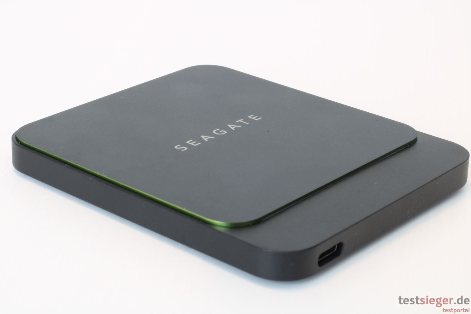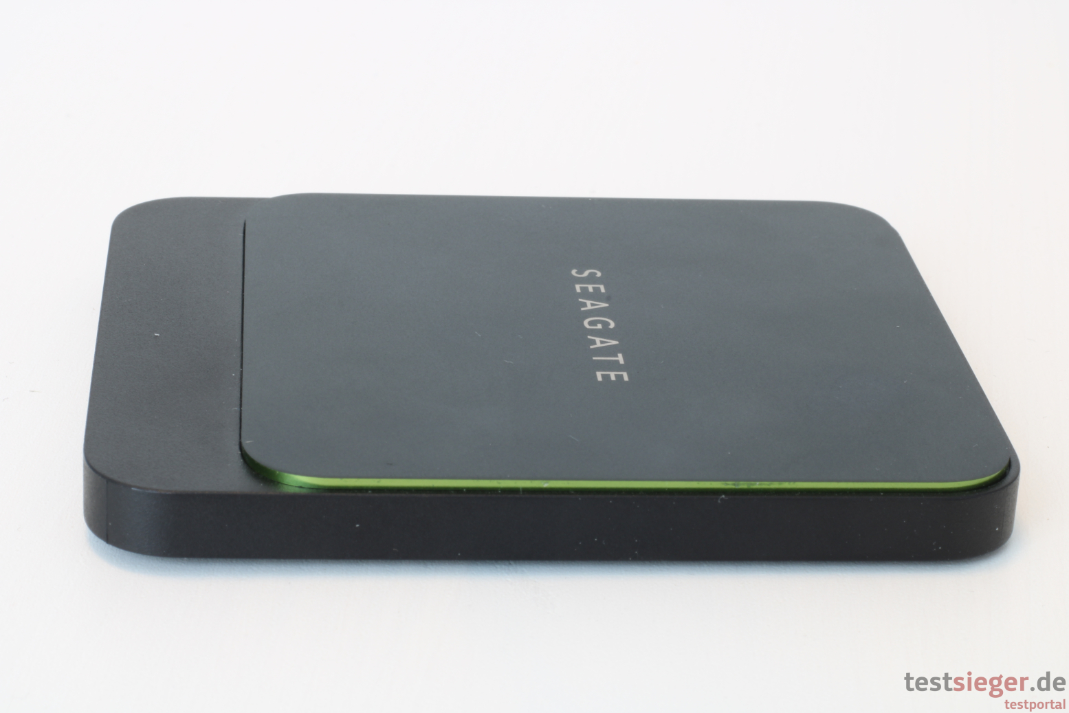 Direkt bei Auspacken der Festplatte fallen die kompakten Abmessungen von 79 Millimetern in der Breite, knapp 93,5 Millimetern in der Tiefe und 9,1 Millimetern in der Höhe ins Auge. Es sind zwar noch platzsparendere Geräte erhältlich, dennoch geht die BarraCuda problemlos mit auf Reisen – falls nötig, sogar in der Hosentasche. Hier spielt auch das niedrige Gewicht von 140 Gramm mit und die Seagate ist fast nicht zu spüren – top. Die restliche Optik ist natürlich Geschmackssacke, uns gefällt das zurückhaltende, fast komplett in Schwarz gehaltene Äußere jedoch. Einziger Farbakzent ist das Seagate-Logo auf der Oberseite. Knapp Dreiviertel der Oberseite ragt ein kleines Stück heraus und ist damit klar vom restlichen Gehäuse abgesetzt. Der dadurch entstehende Rand schimmert leicht grünlich. Zumindest bis der Nutzer die SSD in Betrieb nimmt. Dann erstrahlt der untere Rand durch eine integrierte LED-Leiste in sattem Grün – ein sehr schicker Effekt.