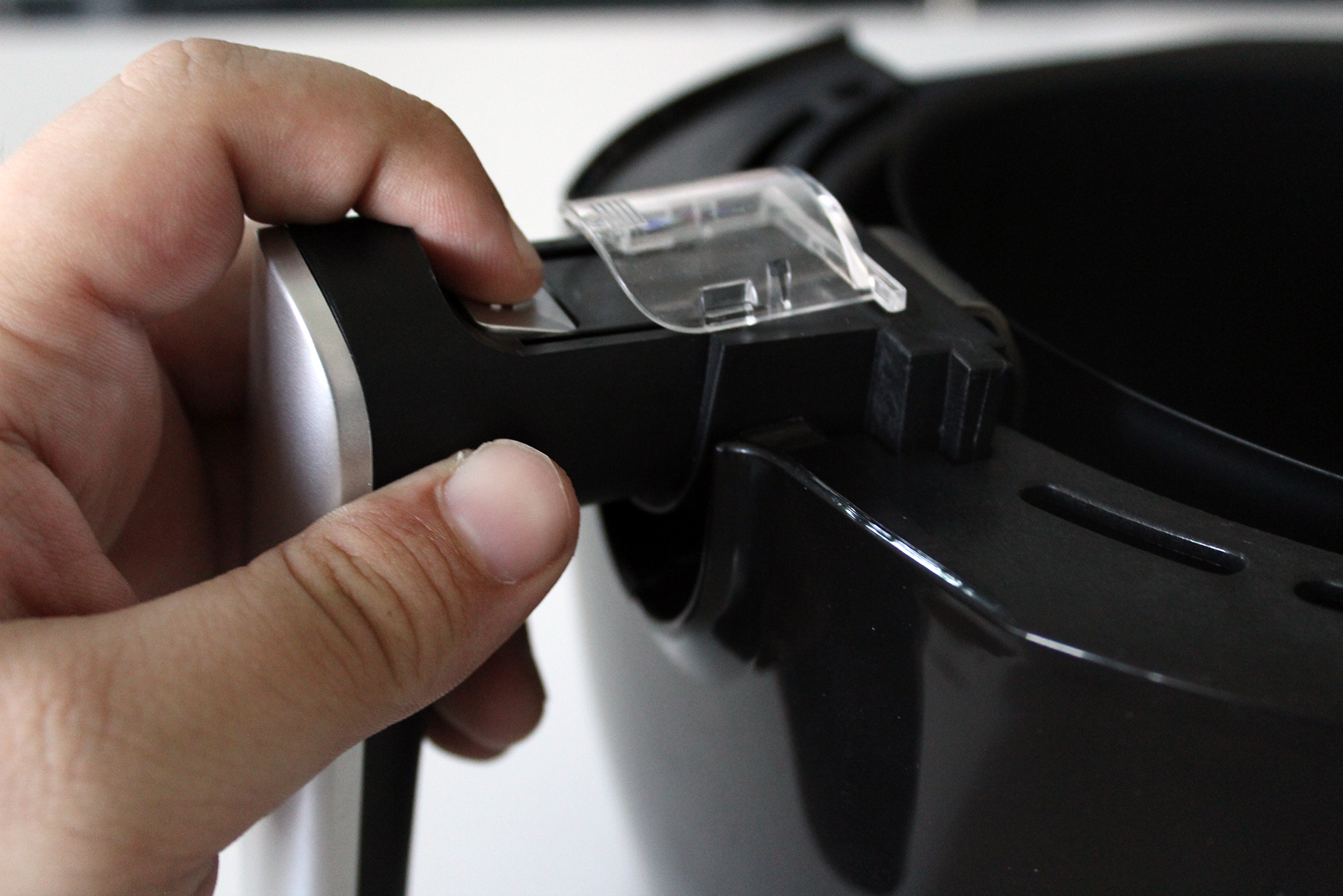 Die Gareinheit nimmt fast die komplette untere Hälfte der Severin FR 2430 ein. Über einen abgewinkelten Griff am Frittierkorb lässt sich die Abdeckung samt Garbehälter noch vorne herausziehen. Der Korb ist über einen Einrastmechanismus mit dem Garbehälter verbunden und lässt sich per Tastendruck lösen. Die gesamte Konstruktion ist zwar etwas wackelig, hält jedoch ordentlich zusammen. Die Gareinheit verfügt über ein effektiv nutzbares Volumen von 3,2 Litern und bietet beispielsweise circa 600 Gramm Pommes frites Platz. Damit lassen sich auch mehrere Personen mit Essen versorgen.