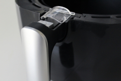 Die Severin FR 2430 ist fast komplett in glänzendem Schwarz gehalten. Optisch macht sie eine gute Figur, was vor allem an der geschwungenen Form und den abgerundeten Elementen liegt. Trotz der glänzenden Oberfläche ist die Fritteuse nicht sonderlich anfällig für Fingerabdrücke, auch wenn sie nicht ganz davor gefeit ist. Die unschönen Flecken halten sich jedoch in Grenzen. Das Äußere der FR 2430 besteht komplett aus Kunststoff. Dieser ist allerdings so robust, dass sich die Seitenwände auch unter hohem Druck nicht verbiegen lassen – vorbildlich. Der Garbehälter punktet durch eine robuste Keramikbeschichtung, damit die Speisen nicht anbacken. Spitze Gegenstände sollte der Nutzer aber vermeiden, da sich schnell Kratzer bilden. Mit Abmessungen von circa 32 Zentimetern in der Höhe, 31 Zentimetern in der Tiefe und 26 Zentimetern in der Breite ist die Severin nicht gerade klein ausgefallen. Da Fritteusen in der Regel aber keine Dauergäste auf der Küchenzeile sind, lassen sich die ausladenden Maße verschmerzen, solange genügend Stauraum vorhanden ist.