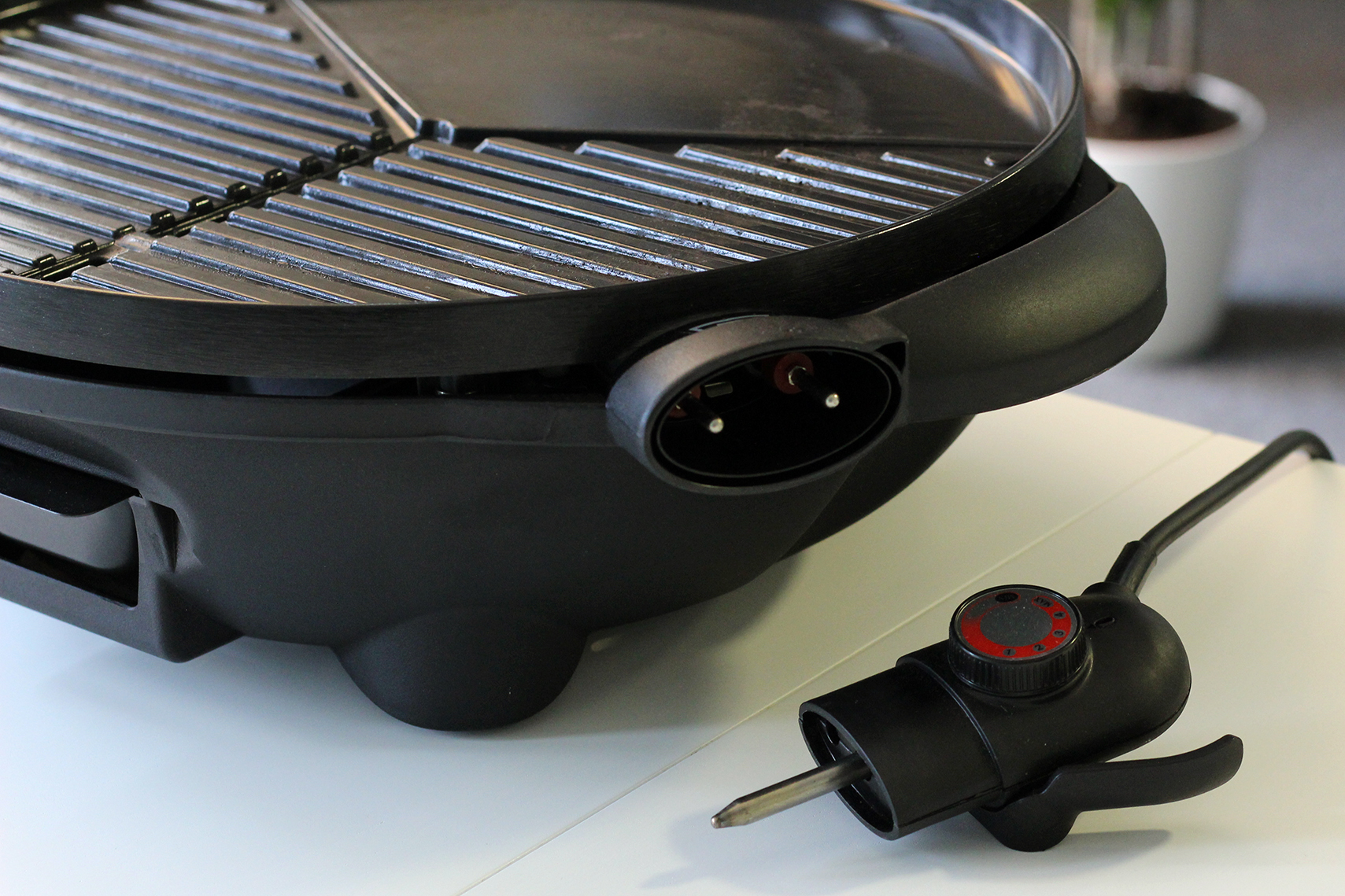 Mit einer Länge von 2,8 Metern lässt das Stromkabel eine flexible Platzwahl problemlos zu. Die Bedienung ist nahezu selbsterklärend. Über das leichtgängige Drehrad lässt sich die Temperatur stufenlos einstellen. Praktischerweise verfügt der Deckel über einen kleinen Haken an der Innenseite und lässt sich damit am Rand einhängen. Dort ist er nicht nur bestens aufgehoben, sondern dient auch als Windschutz. Im Deckel befindet sich ebenfalls das integrierte Thermometer, mit dem sich die Wärme im Innenraum ablesen lässt. Das Messgerät arbeitet recht exakt, die angezeigte Temperatur stimmte in etwa mit unseren Messwerten überein. Auf der Ablage am Standfuß finden sich zwei Vertiefungen für Grillsoßen oder Getränke. Eine zusätzliche, breitere Vertiefung ist für das Grillgut vorgesehen. Allzu viel Platz bietet die Ablage allerdings nicht. Wer viele Gäste bewirten möchte, benötigt einen Beistelltisch.