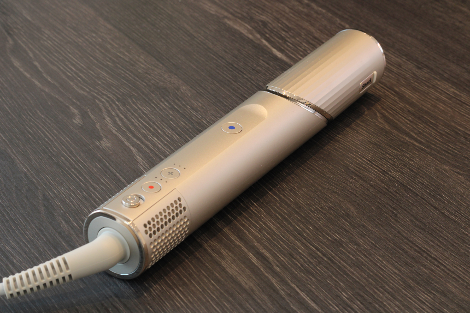 Das Highlight des Shark FlexStyle ist die Tatsache, dass man ihn um 90 Grad drehen kann. Das ist nicht nur beim Föhnen von Vorteil, auch beim Styling mit den Aufsätzen kommen wir mit dem Knick teils besser an unseren Hinterkopf. Das ist aber sicherlich Geschmackssache. Nutzerinnen und Nutzern können frei wählen, ob sie lieber im geknickten oder im Stab-Modus stylen möchten. Das Drehen funktioniert problemlos und ist ohne große Kraftanstrengung möglich. Ebenfalls praktisch ist das mitdrehende Kabel, das flexibel in jede Richtung schwenkt. Sehr gut!