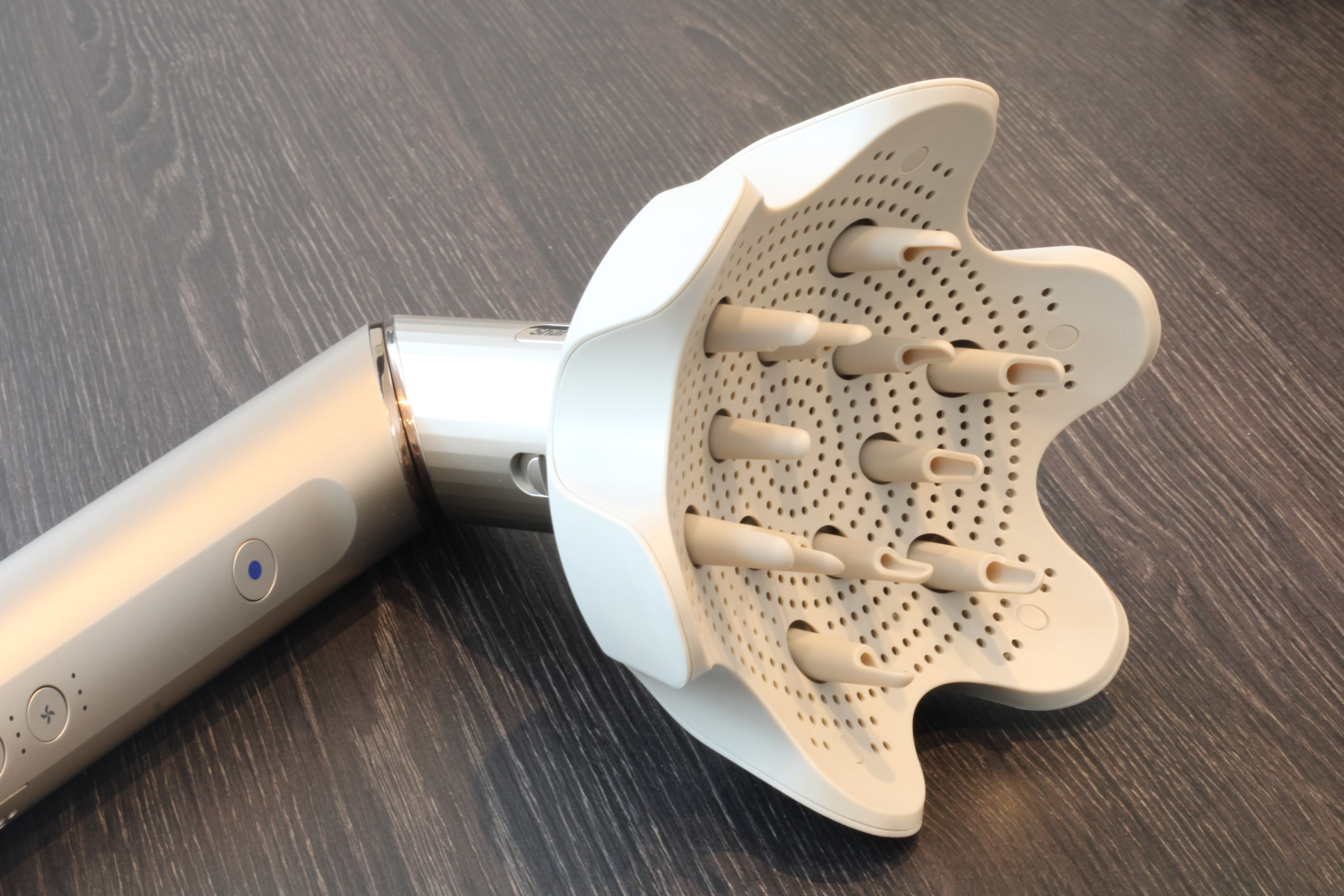 Zum Herausarbeiten von Naturlocken eignet sich der Diffusor, ein klassischer Föhnaufsatz. Dieser fällt beim FlexStyle sehr groß aus und hat versenkbare Noppen für mehr oder weniger Volumen. Bei unserer Testerin mit Naturlocken funktioniert es. Allerdings ist auch hier bei mittellangem, feinem Haar der Aufsatz etwas zu groß.