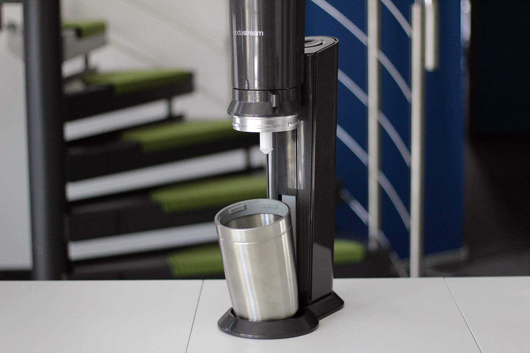 Danach die Oberseite wieder nach unten drücken und den Hebel schließen. Das funktioniert im Gegensatz zum Vorgänger noch etwas einfacher, obwohl es schon da kein Problem dargestellt hat. Da der Nutzer jedoch die Oberseite konstant nach unten drücken muss, benötigt er zwingend beide Hände. Zum Aufsprudeln verfügt der SodaStream Crystal 2.0 über einen großen Knopf an der Oberseite. Dieser hat einen angenehmen Druckpunkt und lässt sich problemlos betätigen.