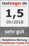 Der SodaStream Crystal 2.0 ist ein guter Wassersprudler. Vor allem durch die schicke Glasflasche hat er einen Vorteil gegenüber seinen Geschwistern. Das Design ist optisch ansprechend, was vor allem den Edelstahl-Bauteilen zu verdanken ist. Die Handhabung bereitet keinerlei Probleme und hat sich im Vergleich zur ersten Generation durch den integrierten Karaffenhalter noch einmal verbessert. Da die Standfüße nun keine Streifen mehr hinterlassen, verbessert sich der SodaStream in der Teilwertung „Design und Verarbeitung“ deutlich und erhält nun von uns eine sehr gute Gesamtwertung.