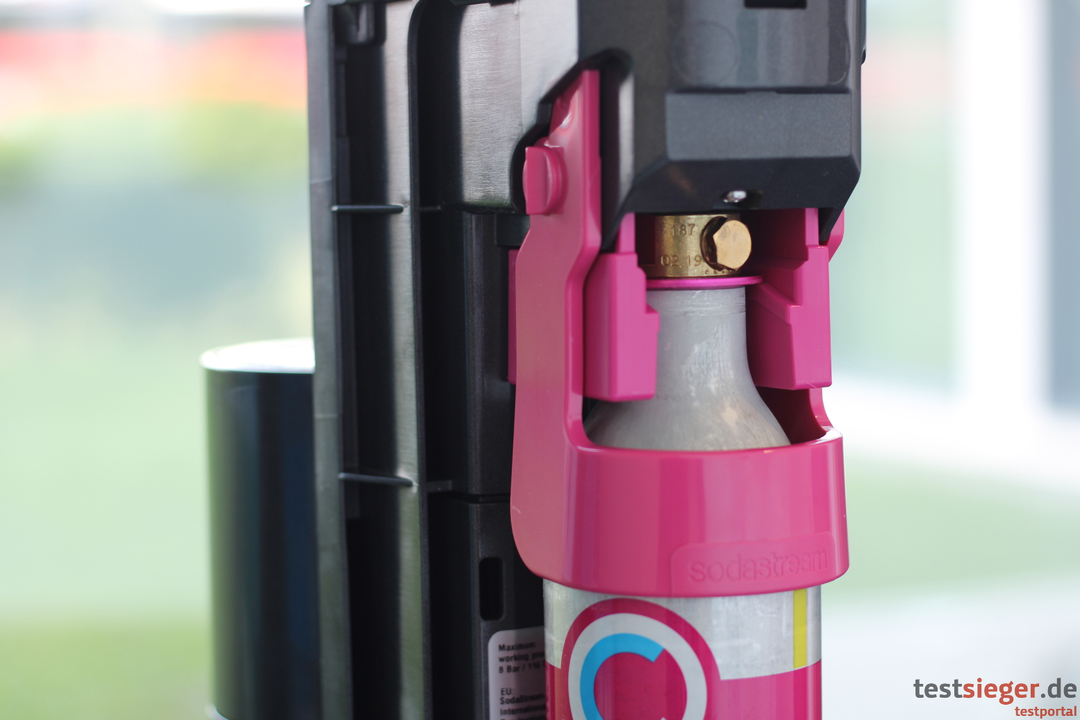 Vor der Inbetriebnahme muss der Nutzer den CO2-Zylinder befestigen. Hier bietet der Duo eine schöne Überraschung. Im Vergleich zu den Vorgängermodellen ist kein Eindrehen mehr angesagt. Stattdessen hat SodaStream dem Sprudler einen praktischen Hebelmechanismus spendiert. Kartusche einfach einsetzen, Hebel nach oben schieben und schon hängt sie sicher im Gehäuse – vorbildlich. Das funktioniert jedoch nur mit speziellen Zylindern, die mit einer magentafarbenen Verschlusskappe gekennzeichnet sind. Herkömmliche CO2-Behälter werden nicht unterstützt. Der Mechanismus befindet sich auf der Rückseite hinter einer Abdeckung, die sicher hält und sich über einen Knopf einfach lösen lässt.