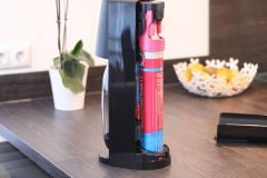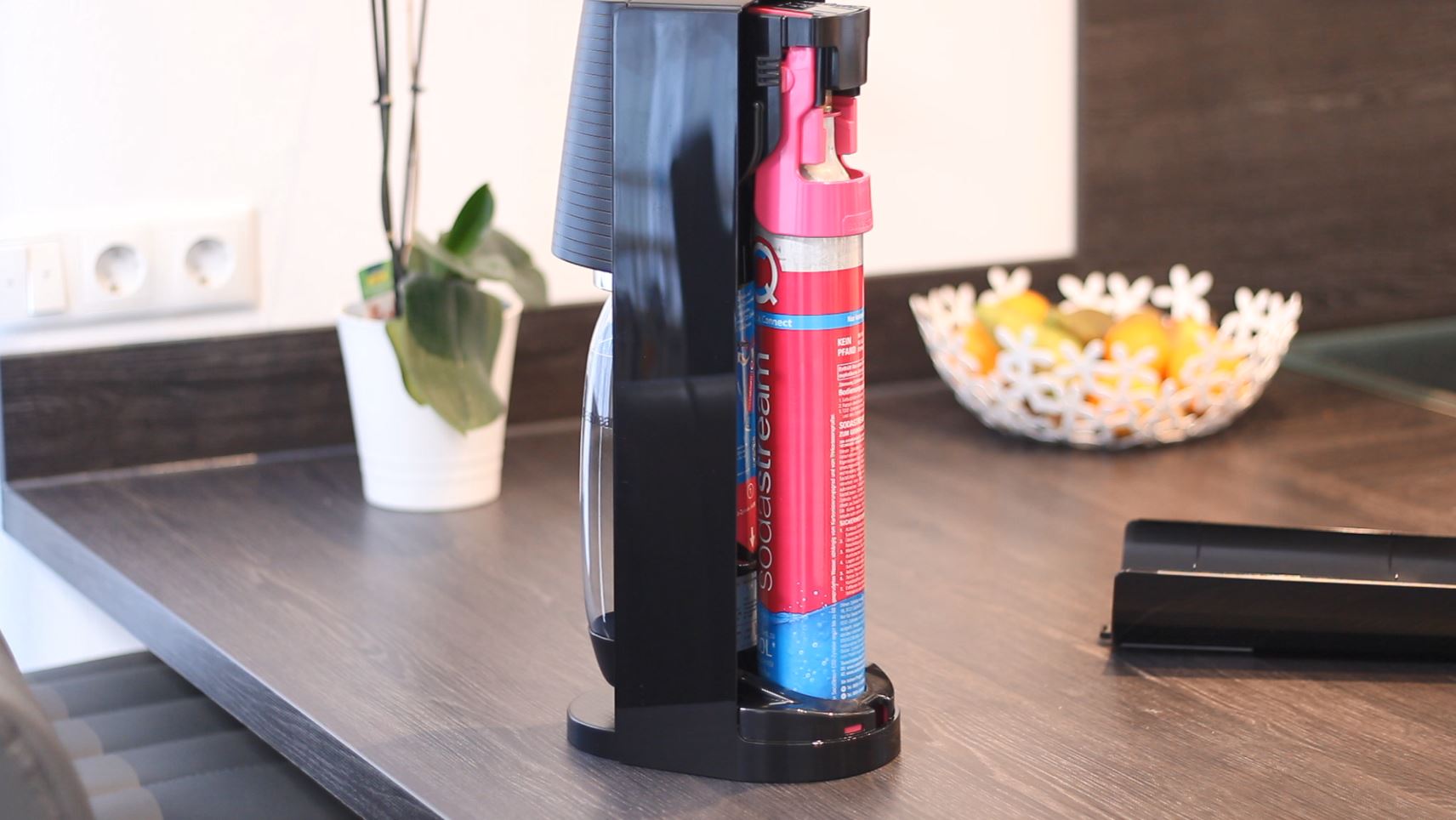 Zunächst müssen Nutzerinnen und Nutzer den beiliegenden Kohlensäure-Zylinder mit dem Terra verbinden. Das System befindet sich hinter der abnehmbaren Rückabdeckung. Erfreulicherweise verwendet SodaStream wie schon beim Duo die neuartige QuickConnect-Variante. Das teilweise umständliche Eindrehen früherer Tage ist damit Geschichte. Nutzerinnen und Nutzer klappen den pinken Hebel nach oben, hängen den Zylinder ein und schließen den Hebel wieder – schon kann es losgehen. Das klappt wunderbar einfach, hat jedoch den Nachteil, dass nur noch die pinkfarbenen SodaStream-Zylinder kompatibel sind.
