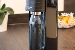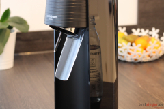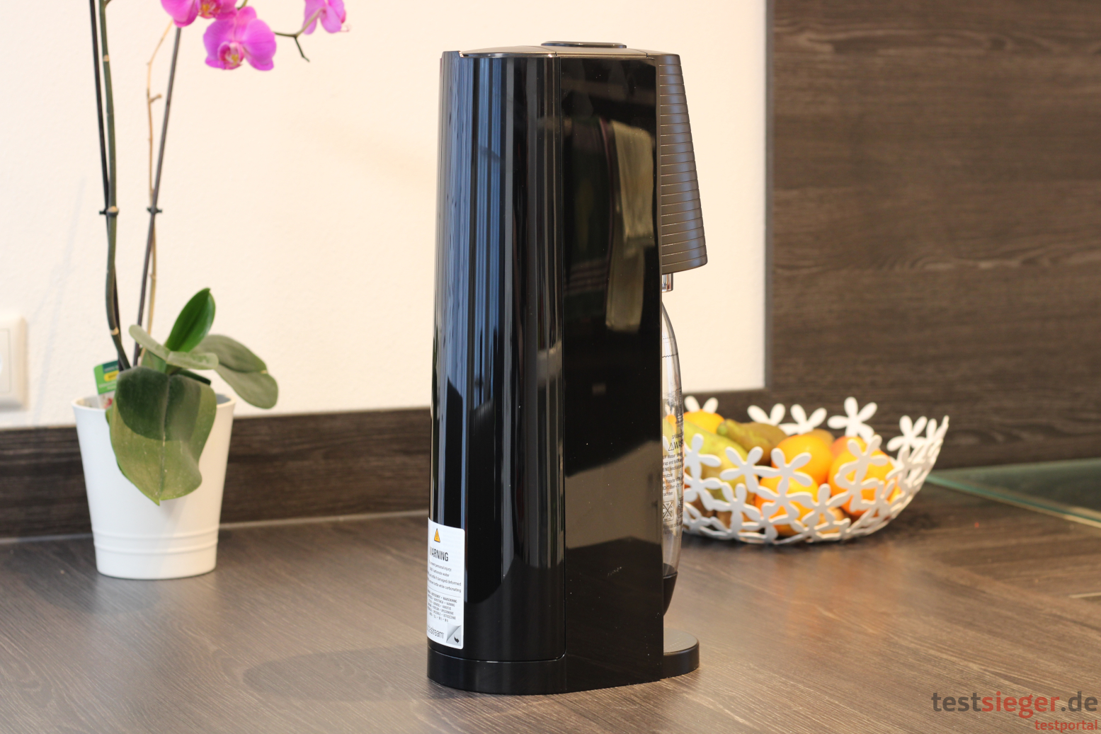 Die Verarbeitungsqualität liegt in einem guten Bereich. Der verwendete Kunststoff wirkt wertig, vor allem die Frontblende und die Oberseite lassen sich selbst unter hoher Last nicht eindrücken. Das gilt für die Seitenteile zwar nicht, trotzdem stellen wir hier eine klare Verbesserung im Vergleich zum SodaStream Easy fest. Die abnehmbare Rückseite schließt sauber mit dem restlichen Gehäuse ab. Die entstehenden Spaltmaße liegt im Normbereich und sind recht gleichmäßig. Allerdings hätten wir uns eine bessere Standfestigkeit gewünscht. SodaStream entscheidet sich gegen Antirutschelemente auf der Unterseite, wodurch das Gerät keinen festen Halt auf dem Untergrund hat und sehr leicht rutscht. Dementsprechend ist es auch nicht möglich, die Flasche trotz einfachem Einklick-Mechanismus mit nur einer Hand einzuhängen.