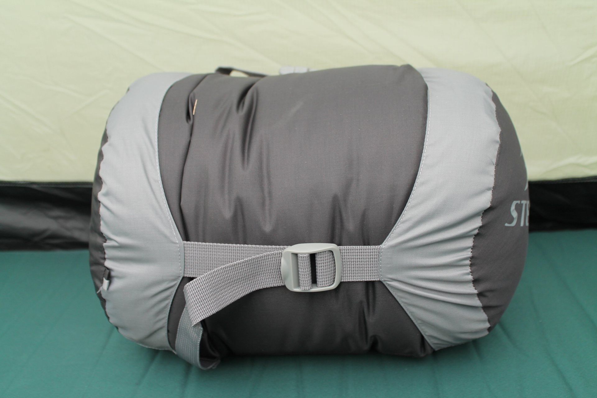 Der Steinwood Kompakt 4-Season kommt im klassischen Kompressionssack. Aus dem Lieferkarton genommen fällt der Schlafsack erstmal sehr positiv auf – oder besser dessen Hülle. Diese wirkt sehr wertig und reißfest. Die drei Kompressionsriemen halten einen Deckel, zwei davon sind fest mit der Hülle verbunden, einer mit Druckschnalle zum Öffnen. Praktisch, denn so bekommt man den Schlafsack fest komprimiert, selbst wenn man ihn nicht mehr sauber im Sack verstauen kann. Der Schlafsack ist in der Hülle maschinell perfekt eingerollt, aber jetzt muss er sich im Einsatz beweisen!