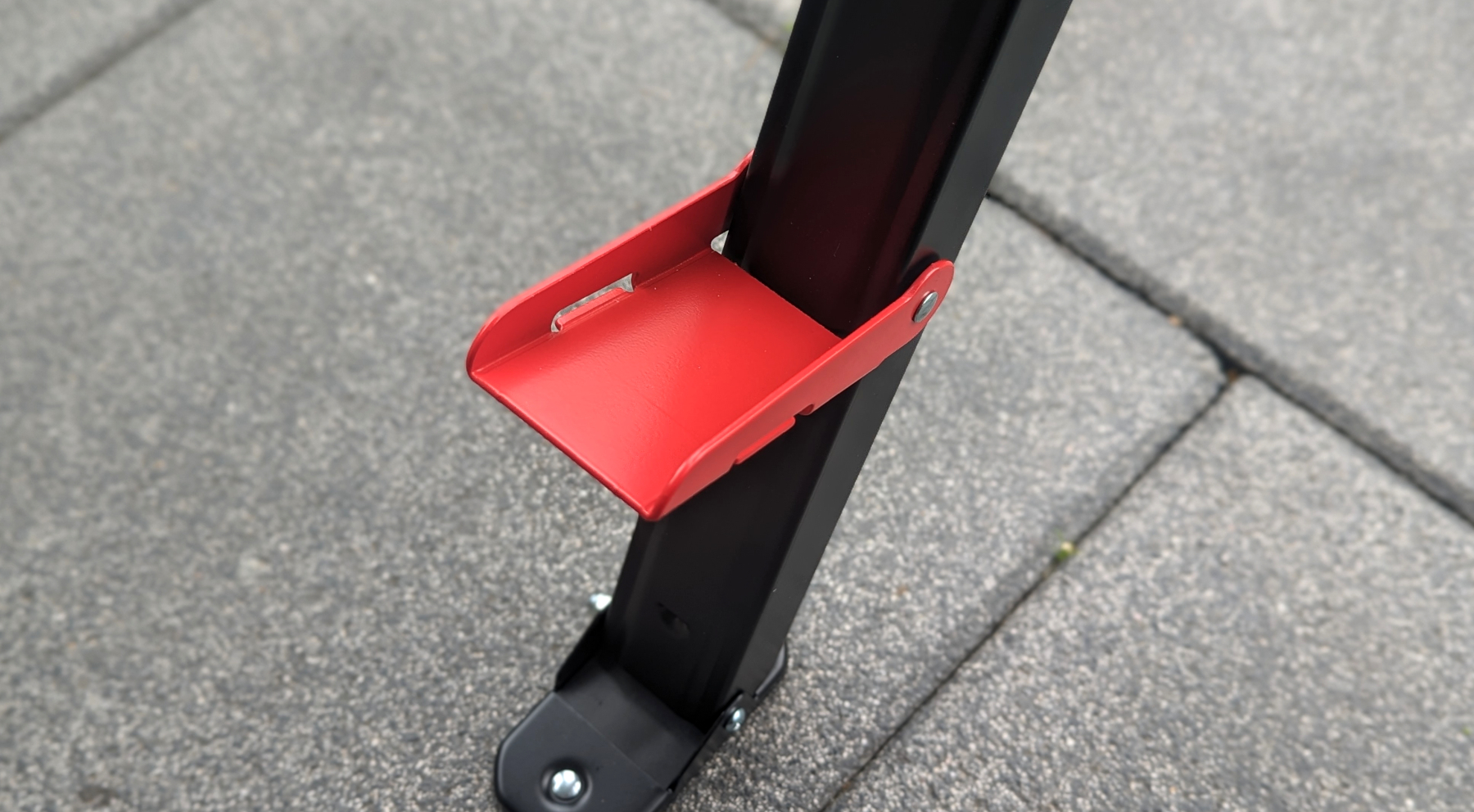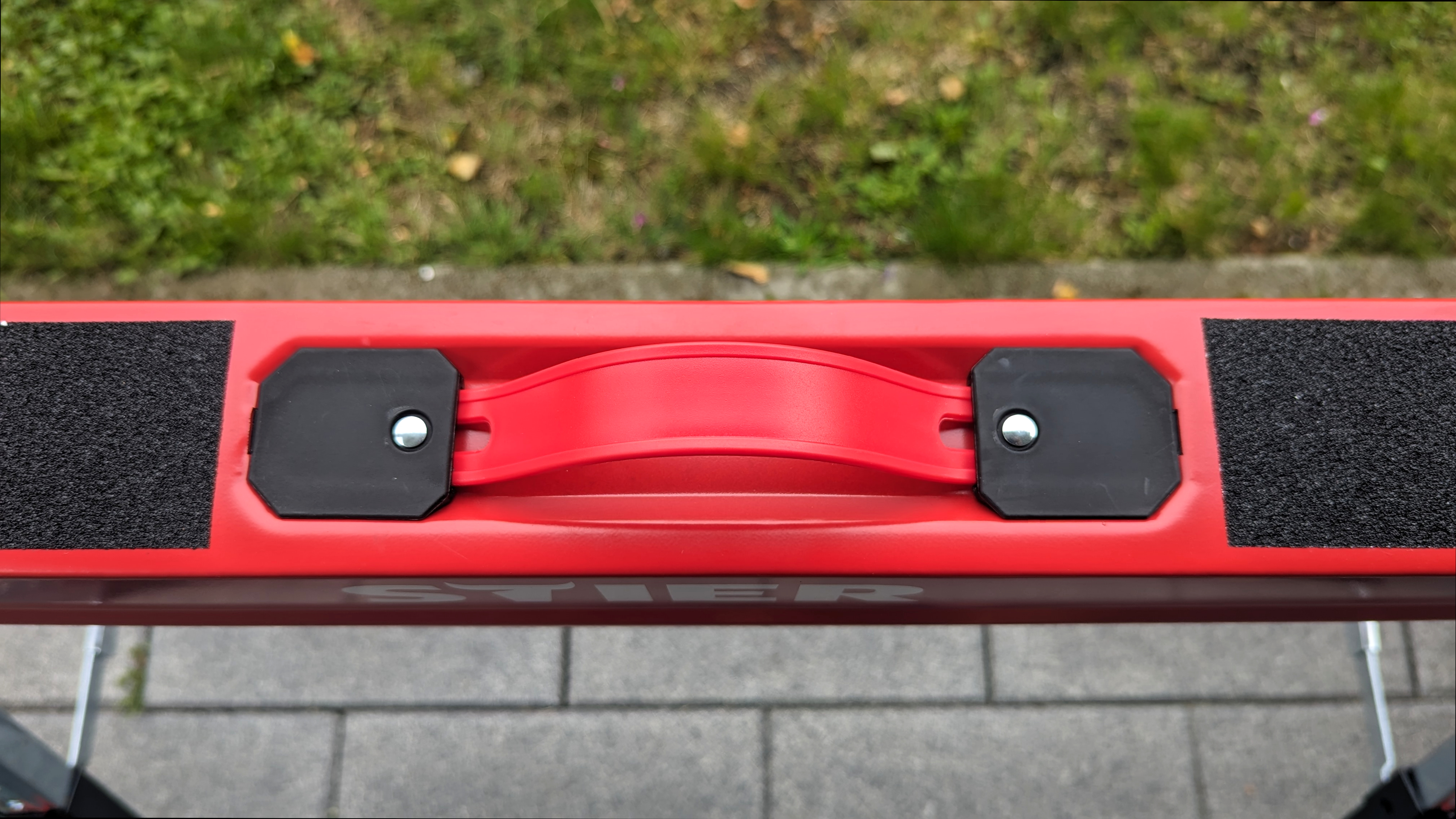 Allerdings gibt es auch einige Kritikpunkte: Die Lackierung an den Füßen ist anfällig für Kratzer. Gerade beim häufigen Zusammenklappen des Arbeitsbocks berühren sich die beiden Beine. Zudem entdecken wir bei unserem Testmuster, dass das Logo und einige Schrauben leichte Kratzer aufweisen. Es handelt sich hierbei zwar lediglich um kosmetische Mängel, die keinen Einfluss auf die Funktionalität haben, aber sie beeinträchtigen den Gesamteindruck in Bezug auf die Verarbeitungsqualität leicht. Insgesamt überzeugt uns der STIER Falt-Arbeitsbock jedoch.