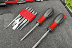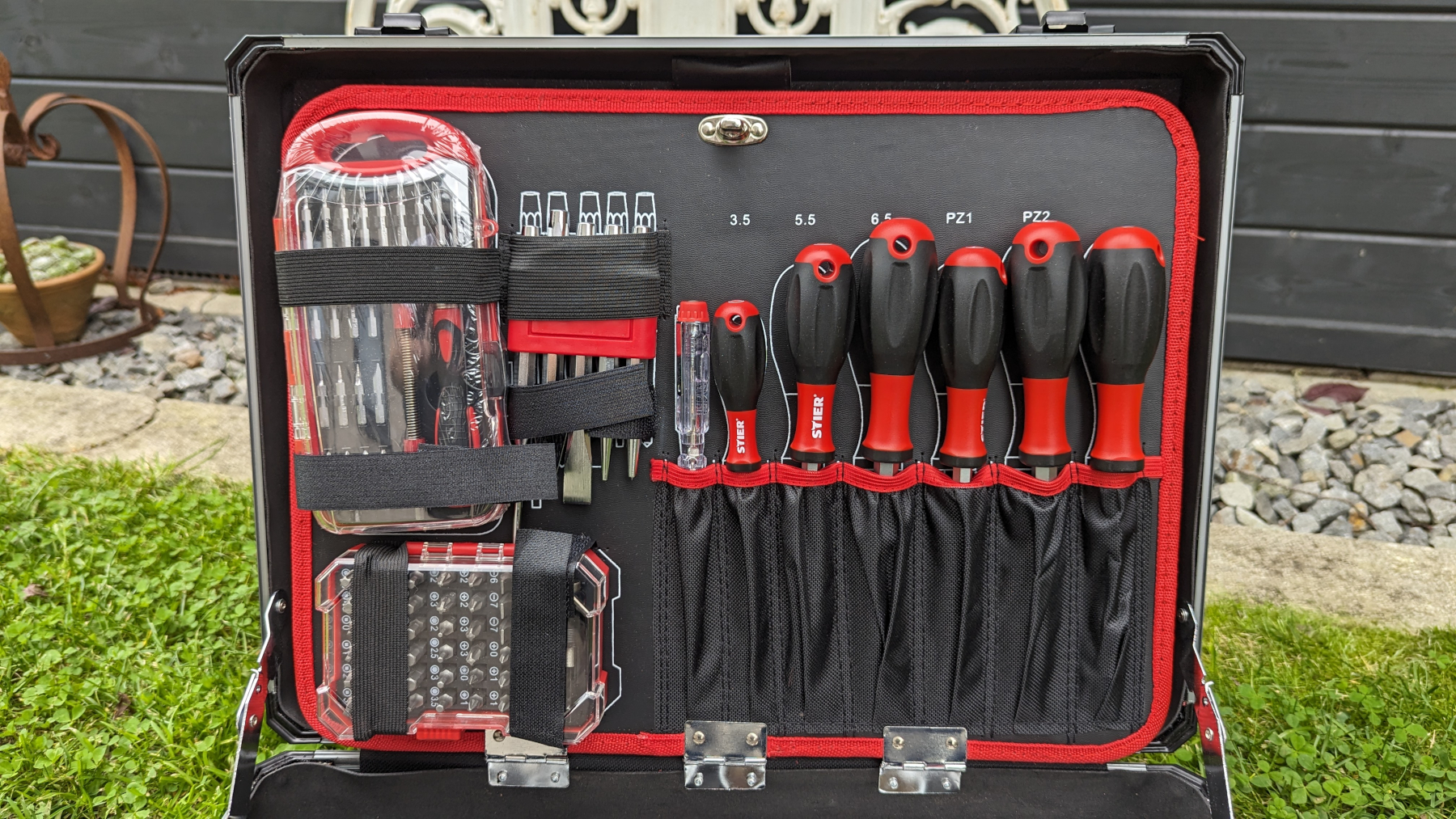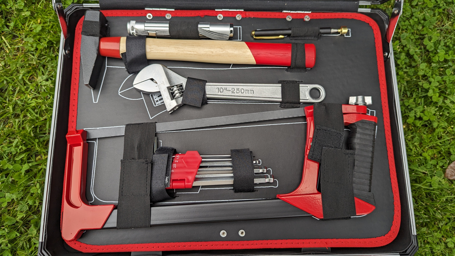 Die Werkzeuge im Koffer sind intelligent in vier verschiedenen Ebenen angeordnet, was die Benutzerfreundlichkeit erhöht und einen schnellen Zugriff auf das benötigte Hilfsmittel ermöglicht. Auf der ersten Ebene befinden sich leicht zugängliche Basisprodukte wie Zangen oder Cuttermesser. Die zweite Ebene beherbergt größere Produkte wie Hammer oder Säge, während in der dritten Ebene Schraubendreher und Bits platziert sind. Die vierte Ebene bietet Schlüsselwerkzeuge, darunter Maul- schlüssel und Umschaltknarren. Verschiedene Befestigungen wie Taschen, Gummis und Klettverschlüsse sorgen in unserem Test dafür, dass die Werkzeuge fest sitzen und sich beim Transport kaum bewegen. Dies ist wichtig, da es ein Lösen der Hilfsmittel während des Einsatzes verhindert.