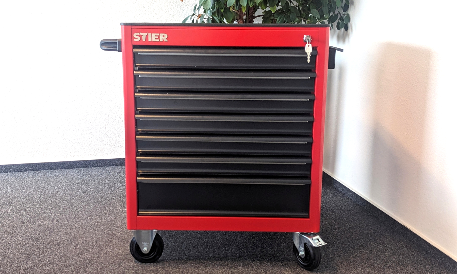Der STIER Werkstattwagen kommt ohne mitgeliefertes Werkzeug. Er bietet insgesamt 7 Schubladen – 6 kleinere und 1 größere. So lassen sich eine Vielzahl an Werkzeugen und Materialien geordnet lagern. Zudem erleichtern die mitgelieferten Aluminiumleisten die Organisation. Sie lassen sich in die verbauten Führungen einlegen und machen das eigene Werkzeug trennbar. Ebenfalls positiv sind die zentral verschließbaren Schubladen. Sie erschweren, dass Werkzeuge oder wertvolles Material entwendet wird.