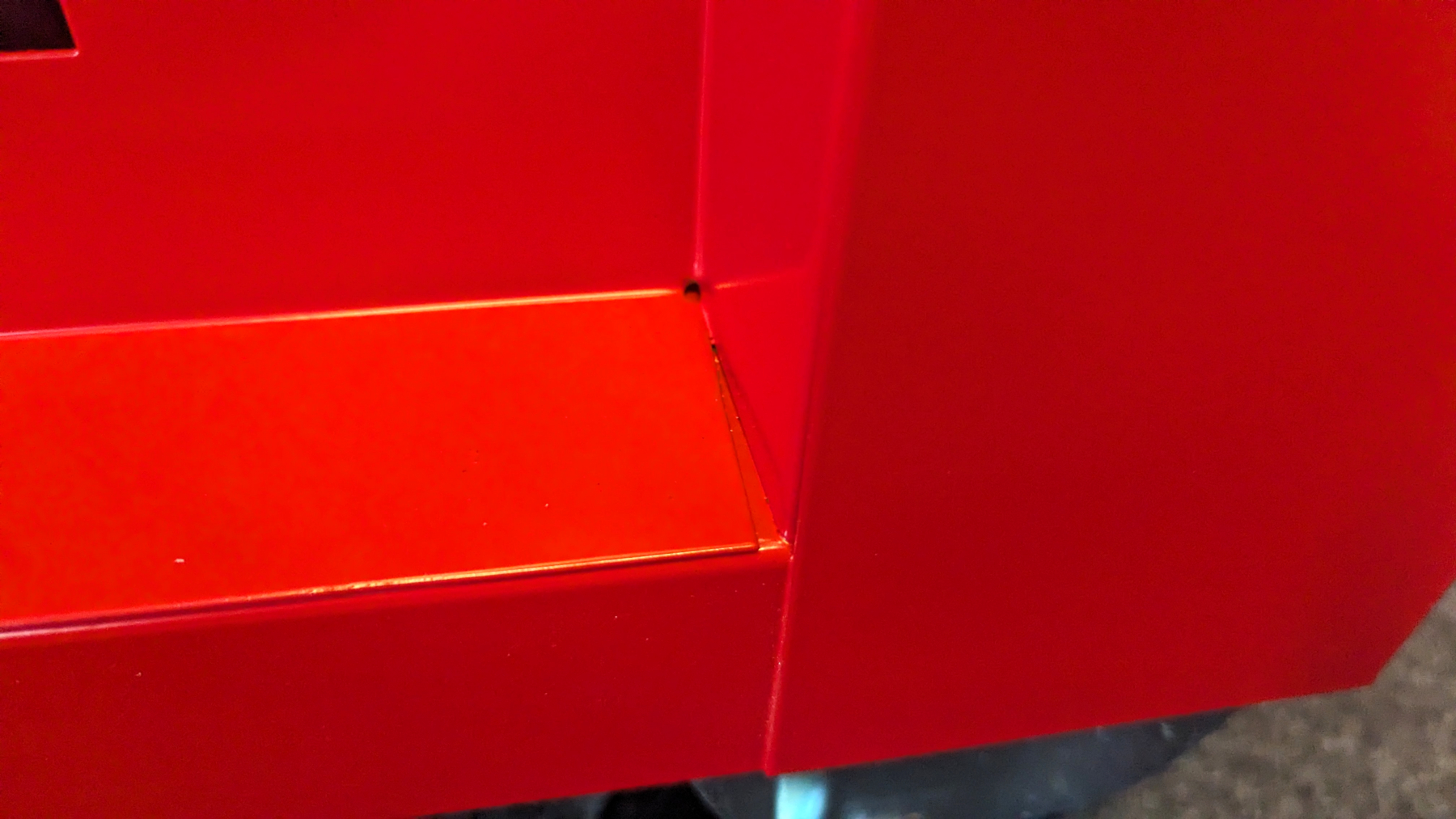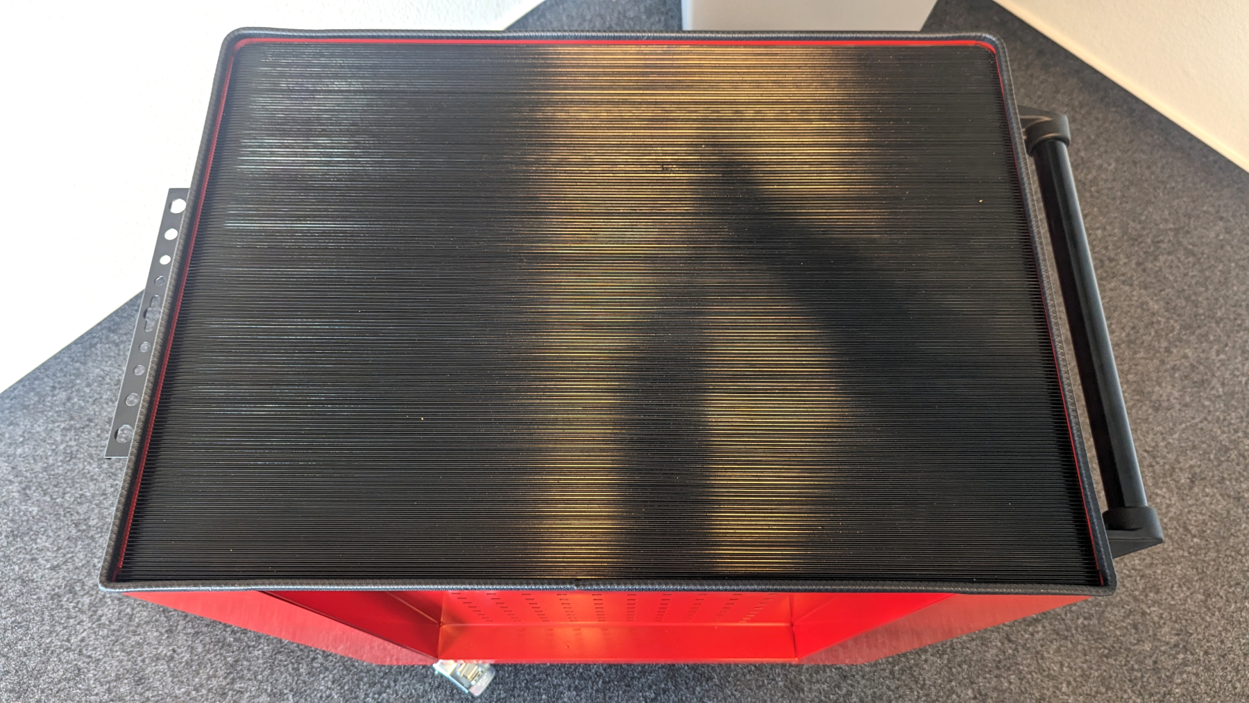Der Wagen ist zu großen Teilen mit einem glänzenden Lack bedeckt. Die Schubladen sind Schwarz und der Rest des Gehäuses ist in Rot gehalten. Diese Farbwahl verleiht dem Wagen eine ansprechende Optik, die sich in jede Werkstatt gut einfügen sollte. Der Wagen besteht zu großen Teilen aus robustem Aluminium, das wir selbst unter hohem Druck nicht verbiegen können – sehr gut. Der Griff ist aus Kunststoff und ebenso robust wie die restlichen Materialien.Kritik gibt es von uns für die nicht passgenauen Seitenteile. Bei genauerem Hinsehen fällt auf, dass ein Seitenteil nicht sauber zusammengefügt ist. So stehen die Kanten nicht bündig zueinander. Dies trübt den ansonsten positiven Gesamteindruck jedoch nur minimal. Die Schubladen des Werkstattwagens fühlen sich stabil und wertig an und gleiten sauber in ihre Führung. Die bereits montierte Arbeitsplatte besteht aus gummiertem Kunststoff und schließt an den Rändern passend ab.