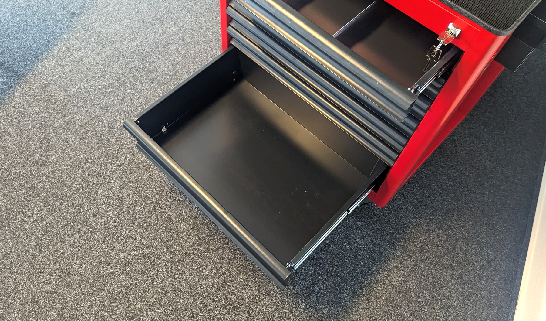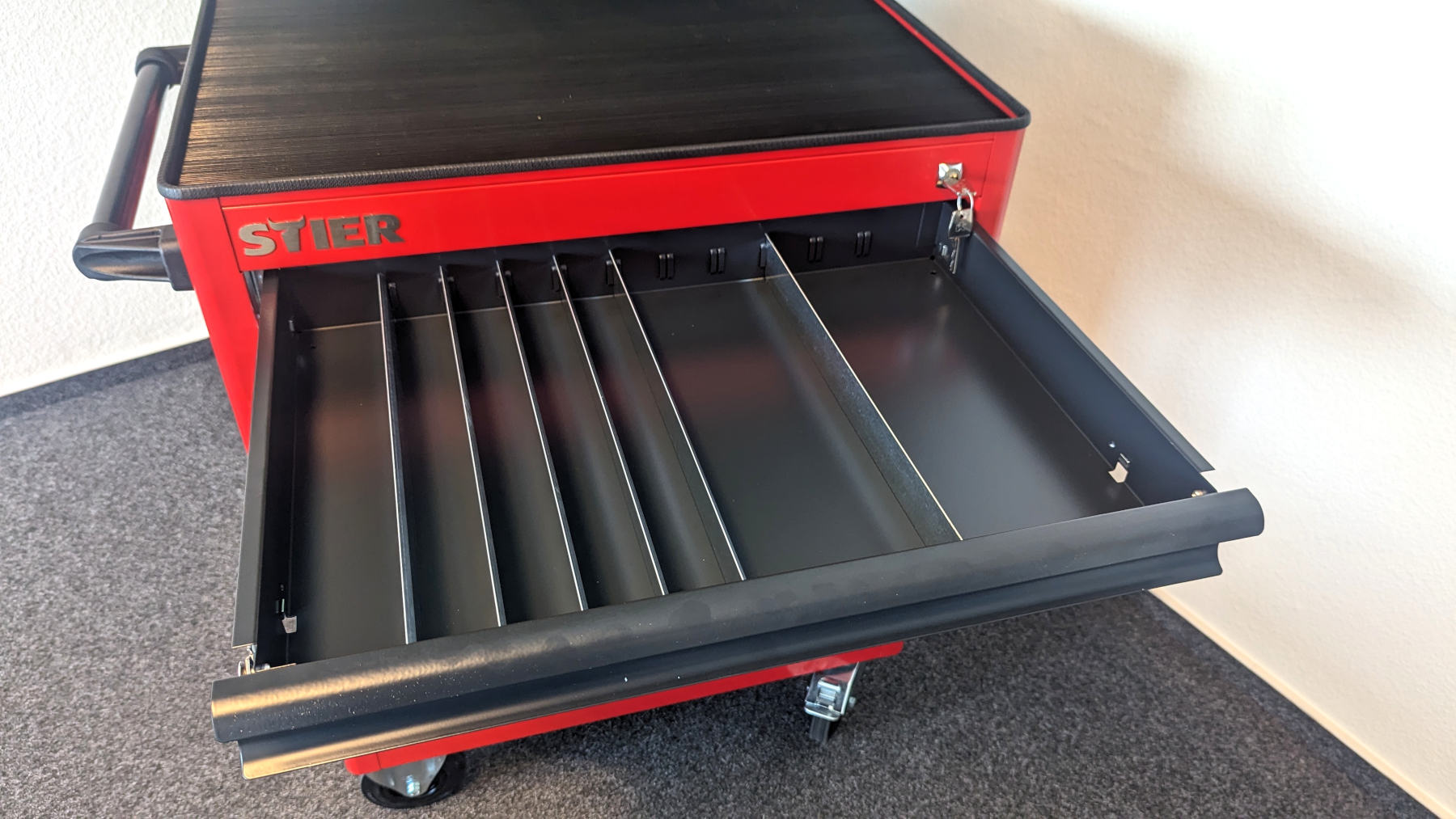 Für den Transport verbaut STIER jeweils 2 Bock- und Lenkrollen. Diese ermöglichen es, den Wagen sicher an einem Ort zu fixieren. Gleichzeitig gewährleisten beide Rolltypen einen guten Mix aus Stabilität und Flexibilität – sehr gut. Allerdings gibt es auch ein paar Punkte mit Verbesserungspotenzial. Eine integrierte Steckdose für die Stromversorgung wäre ein nützliches Feature, besonders wenn elektrisch betriebenes Werkzeug oder Beleuchtung verwendet wird. Ebenso fehlen im Vergleich zu anderen Werkstattwagen Gummiauflagen in den Schubladen. Diese würden nicht nur das Werkzeug schützen, sondern auch für zusätzliche Stabilität und Rutschfestigkeit sorgen.
