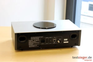 Anders sieht es hier an der Rückseite aus, wo Schrauben und der DAB-/FM-Antennenanschluss hervorstehen, der Anschluss ganze 1,5 Zentimeter. Daneben finden wir hier den Netzkabelanschluss, einen AUX-Eingang für tragbare Audio-Player, einen optischen Digitaleingang für DVD-Player mit Lichtwellenreiter, einen USB Typ-A-Anschluss und darunter einen LAN-Anschluss. Mit dem Angebot an analogen Anschlüssen sind wir zufrieden.