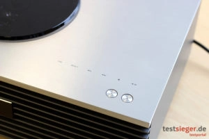 Die Anlage in der Farbvariante Dunkelsilber (auch komplett in Schwarz erhältlich) präsentiert sich als kompakt und kantig. Mit Abmessungen von 45 Zentimetern in der Breite, 13 Zentimetern in der Höhe mit Füßen (ohne Füße 11,5 Zentimeter) und einer Tiefe von 26,2 Zentimetern fällt die Anlage nicht unbedingt klein aus. Zu groß für den Standort im Regal ist sie aber nicht. Die obere Abdeckung ist aus gebürstetem Aluminium, Kratzer und Fingerabdrücke haben hier keine Chance. Dort befindet sich auch die CD-Einlage, deren Abdeckung ungefähr einen halben Zentimeter hervorsteht. Die Plastikabdeckung dreht sich um 360 Grad und rastet auf halbem Weg für die CD-Einlage ein. Hier steht die Abdeckung allerdings 9,5 Zentimeter über das Gerät hinaus. Das ist bei der Platzierung und CD-Nutzung zu beachten. Außerdem ist die Plastik-Abdeckung anfällig für Fingerabdrücke und lässt sich etwas nach unten biegen, hier ist also Vorsicht geboten.