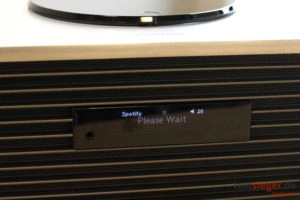 Mit am wichtigsten sind heutzutage Streaming-Dienste wie Spotify & Co. Auch hier lässt sich das Kompaktsystem nicht lumpen: Neben Spotify unterstützt es TIDAL und Deezer. Die Musikwiedergabe via Bluetooth von Spotify funktioniert einwandfrei. Das Display gibt Auskunft über die ausgewählte Quelle, die Lautstärke, den Titel, Interpret, das Album und sogar die Kiloherz-Angabe. Ganze drei haptische Knöpfe gibt es auf der Oberseite: einen zum An- und Ausschalten und zwei zur Lautstärkeregelung. Über Letzteren befinden sich sechs weitere Steuerungseinheiten, die per Berührung betätigt werden. Ein kurzer Piepton ertönt, dann wird der Befehl ausgeführt. Hier befindet sich auch eine nützliche Favoritentaste, die die eigenen Lieblingssender, -playlists und –podcasts wiedergibt. Bis zu neun Voreinstellungen können wir hier vornehmen.