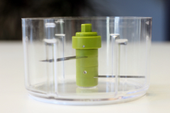 Die Handhabung ist absolut selbsterklärend, trotzdem liegt dem 5-Sekunden-Zerkleinerer eine detaillierte Anleitung bei. Das Gerät besteht aus drei Komponenten: dem Behälter, der Klingeneinheit und dem Deckel samt Seilzug mit Griff. Der Deckel wird mit einer leichten Drehbewegung auf das Gefäß gesetzt und hält danach bombenfest. Der Griff des Seilzugs ist ergonomisch geformt und bietet problemlos vier Fingern Platz. Das Seil ist zudem angenehm leichtgängig, selbst wenn sich härtere Lebensmittel im Zerkleinerer befinden. Mit einem Fassungsvermögen von 500 Millilitern bietet der Tefal beispielsweise einer großen geviertelten Zwiebel Platz.
