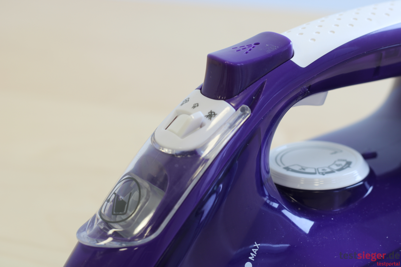 Die Dampfstärke lässt sich über einen Regler am Griff einstellen. Der Nutzer kann sich zwischen viel, wenig oder gar keinem Dampf entscheiden. Ein zusätzlicher Dampf-Boost wird über eine Taste unterhalb des Griffs eingestellt. Laut Tefal werden bei der Nutzung des Dampf-Boost 90 Gramm Dampf pro Minute ausgeschüttet. Die ständige Dampfausschüttung zwischen 0 und 25 Gramm pro Minute. Die Dampf-Boost-Taste soll laut Hersteller ergonomisch geformt worden sein und somit einfach zu bedienen sein. Allerdings ist der Tastendruckpunkt nicht besonders leicht und die Tastenoberfläche rutschig, sodass es beim Bügeln fast gar lästig ist, diesen Knopf betätigen zu müssen. Auch die Tatsache, dass die Taste unterhalb des Griffs liegt, macht die Bedienung nicht einfacher. Dahingegen hat die Spray-Taste, die sich an der Oberseite des Griffs befindet, einen angenehmen Druckpunkt und lässt sich einfach betätigen.