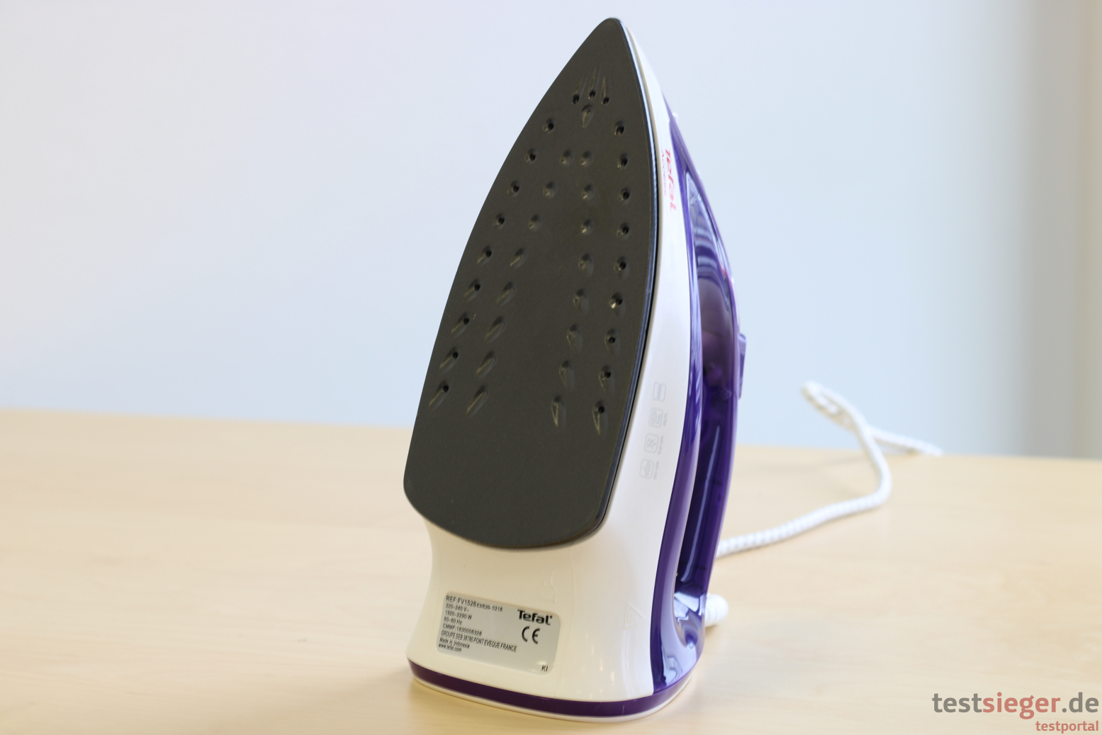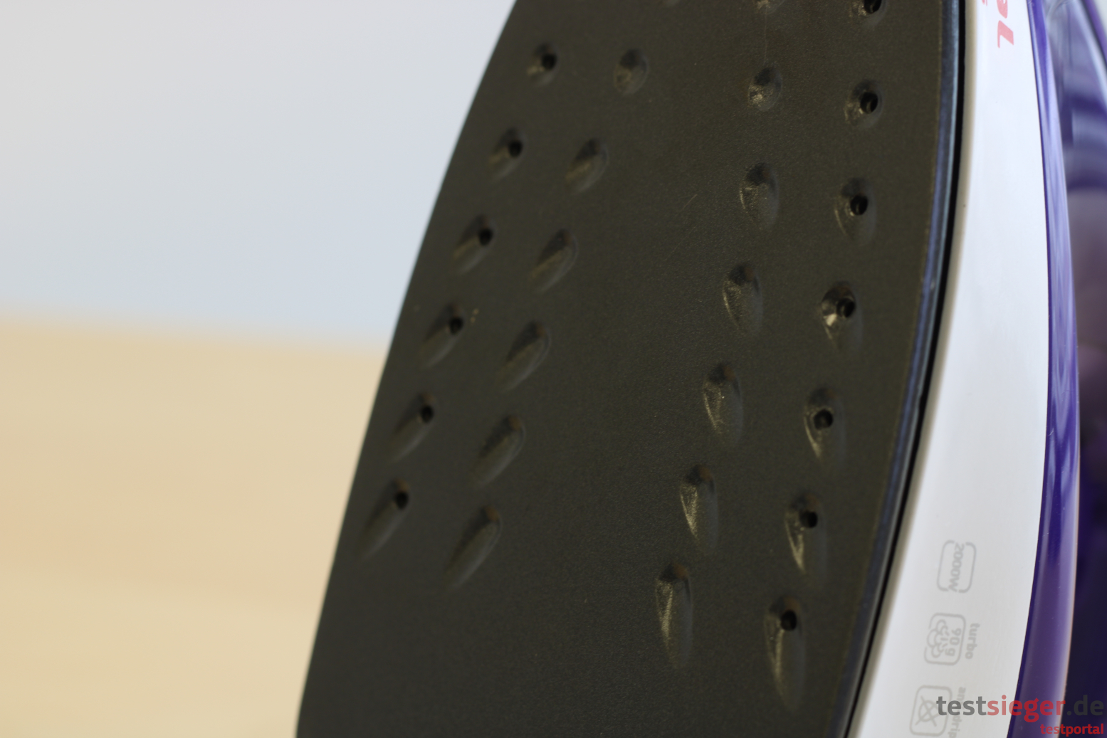 Die Sohle besteht aus PTFE, auch Teflon genannt. Das Material ist nicht allzu kratzfest und es lassen sich recht schnell Gebrauchspuren finden. Deshalb sollte der Nutzer bei der Verwendung auf Knöpfe und Reißverschlüsse achten und nicht direkt darüber bügeln.