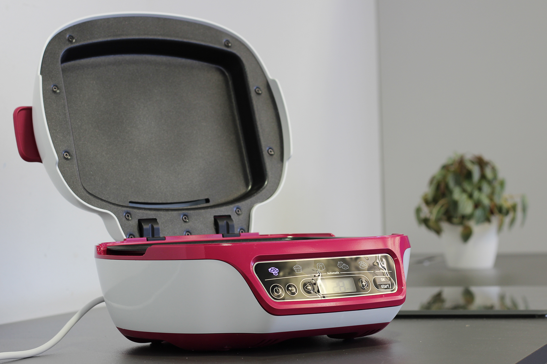 Das Stromkabel ist mit knapp einem Meter recht kurz ausgefallen und lässt sich nicht im Gehäuse verstauen. Alle Knöpfe befinden sich an der Vorderseite und haben einen angenehmen Druckpunkt. Die Power-Taste startet das Gerät und das Symbol für das Kuchenprogamm blinkt. Über die Pfeiltasten wählt der Nutzer dann den gewünschten Automatikmodus oder die manuelle Zubereitung aus. Neben dem Programm für große Kuchen finden sich noch die Zubereitungsarten für einzelne kleine Kuchen, Lavakuchen, Müsliriegel/Baiser und zum Schmelzen von Schokolade. Bei den Automatikprogrammen gibt die Cake Factory die Temperatur vor und passt diese an den entsprechenden Backschritt wie Aufgehen oder Bräunung an. Die Zeit ist zwar ebenfalls vorgegeben, lässt sich jedoch noch den eigenen Vorlieben entsprechend anpassen. Wer auch die Hitze wählen möchte, verwendet den manuellen Modus. Die OK-Taste bestätigt die Eingaben und startet schlussendlich auch den Zubereitungsprozess.